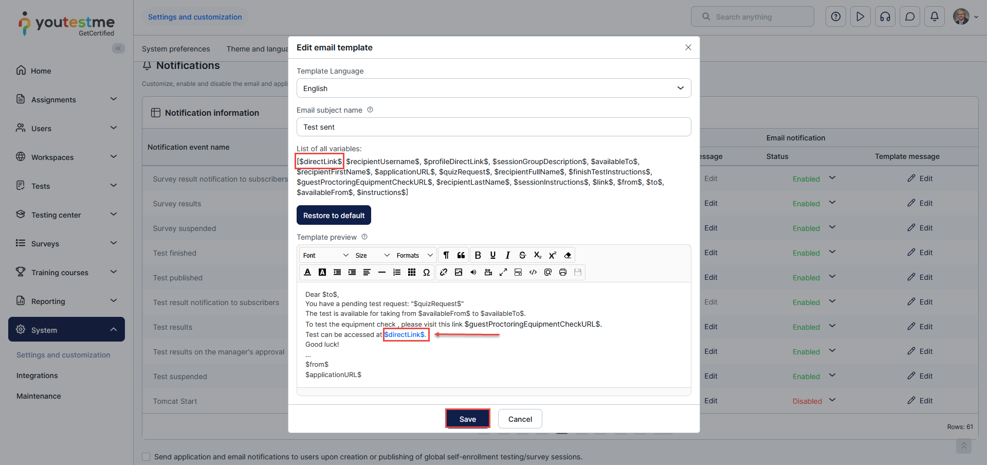 Include the $directLink$ variable in the email notification template, make the necessary adjustments, and then click the Save button to save the modifications.