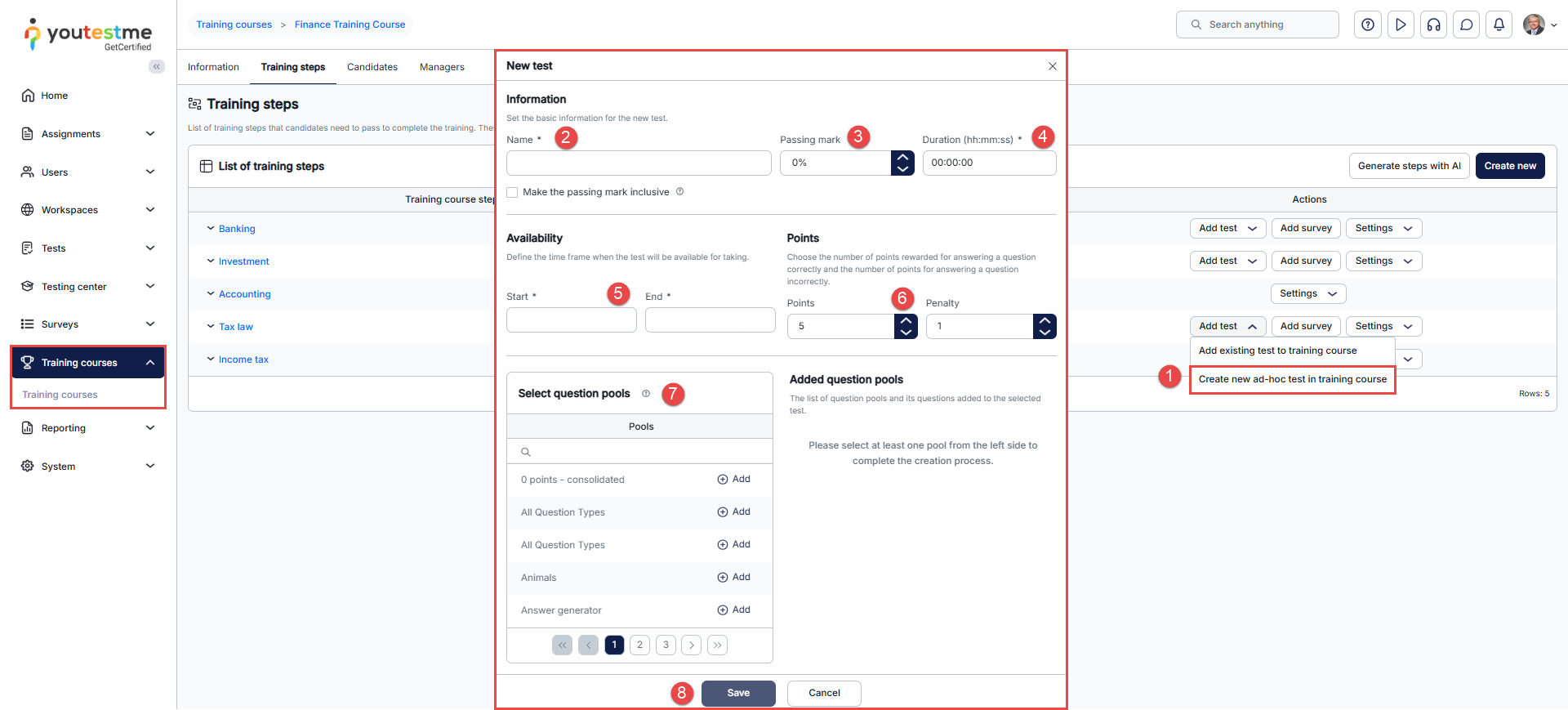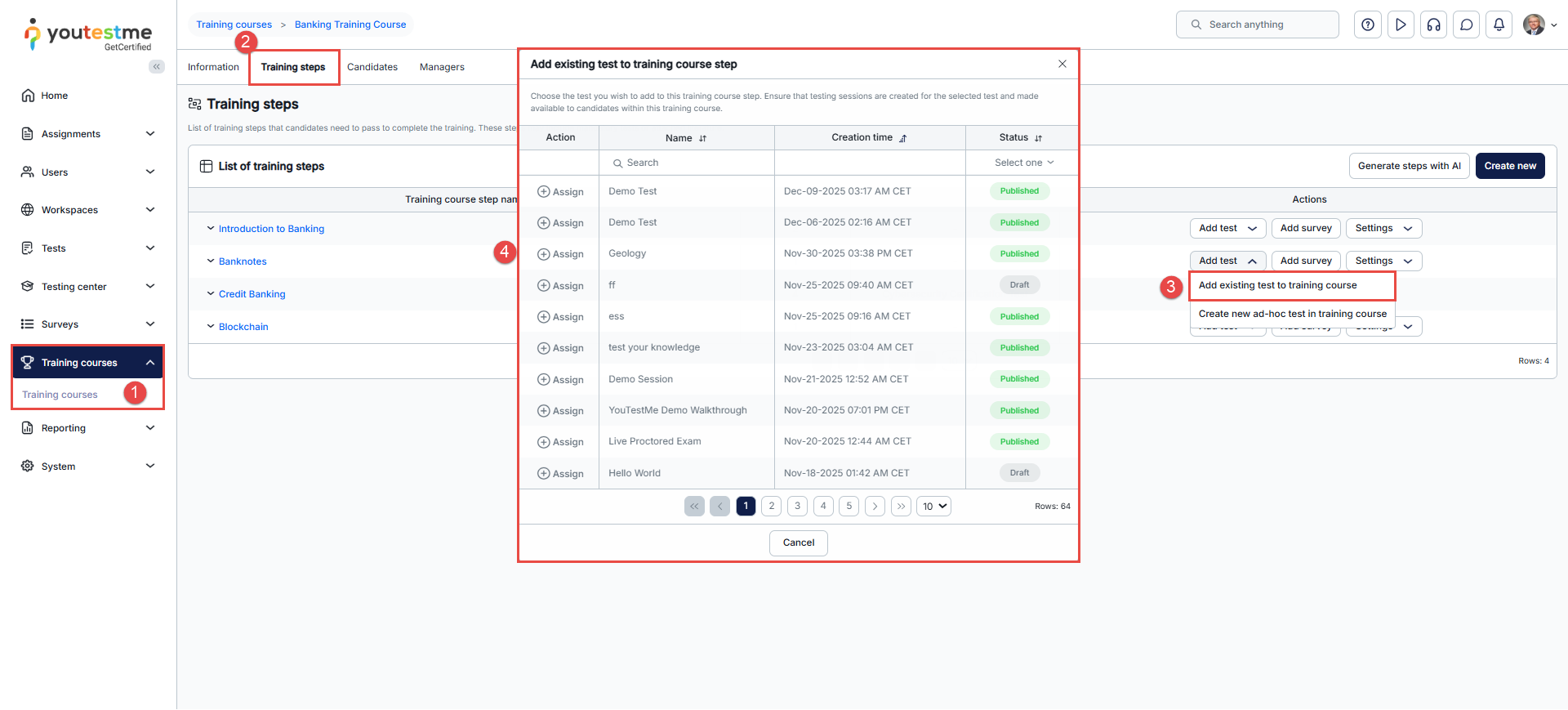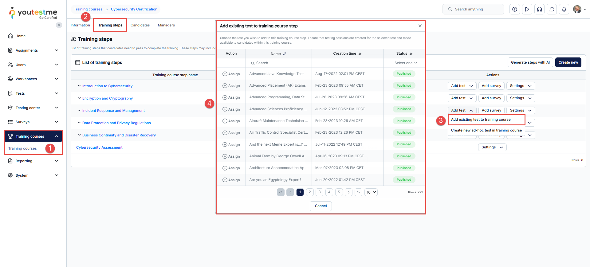 - Click the Add test button in the Actions column and select the Add existing test to the training course option.