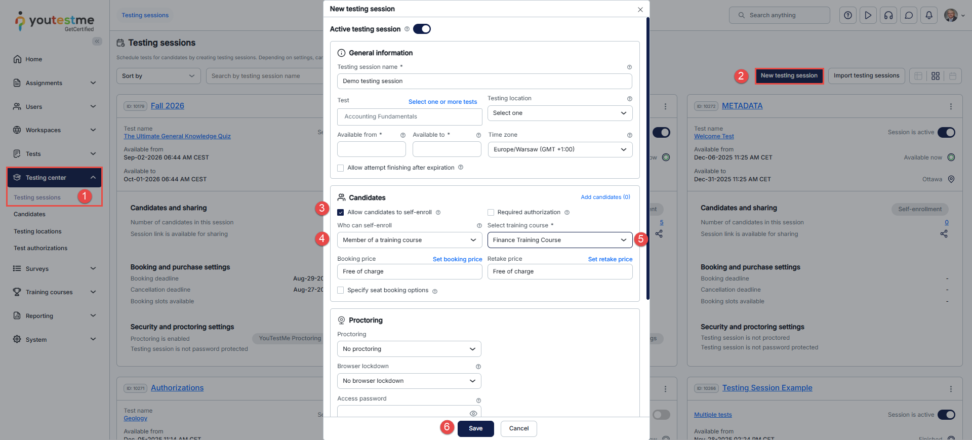 Note: A testing session will be automatically created when you create an ad hoc test. To allow candidates to start this test in a training course, assign them to the training under the Candidates tab or enable self-enrollment under the Information tab.