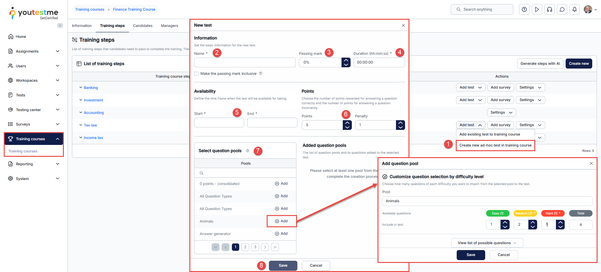 Note: You can add more question pools. - Click the Save button to add the test to the training course step.
