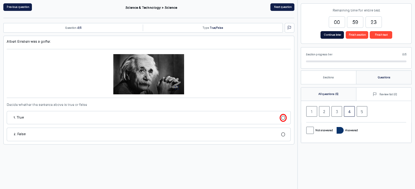 A True/False question presents two possible answers, allowing the candidate to select only one.