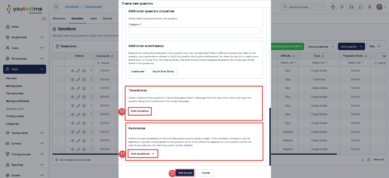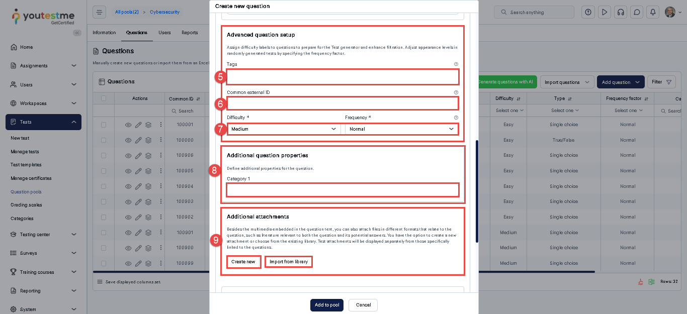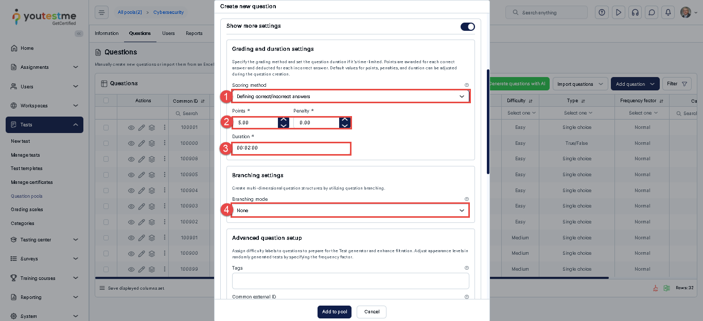 - Define the number of points, penalties, the question’s difficulty level, and duration. The question duration will only apply if the test duration is calculated based on question duration.