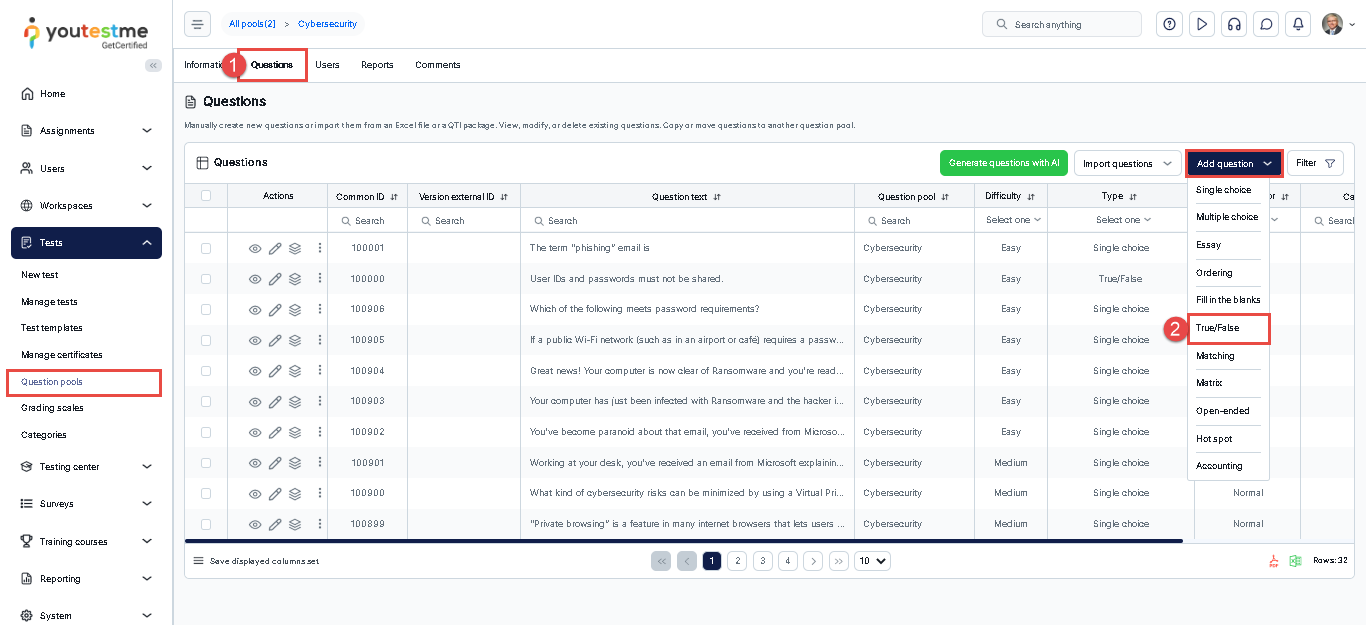 - Access the desired question pool to which you would like to include the True/False question and navigate to the Questions tab.