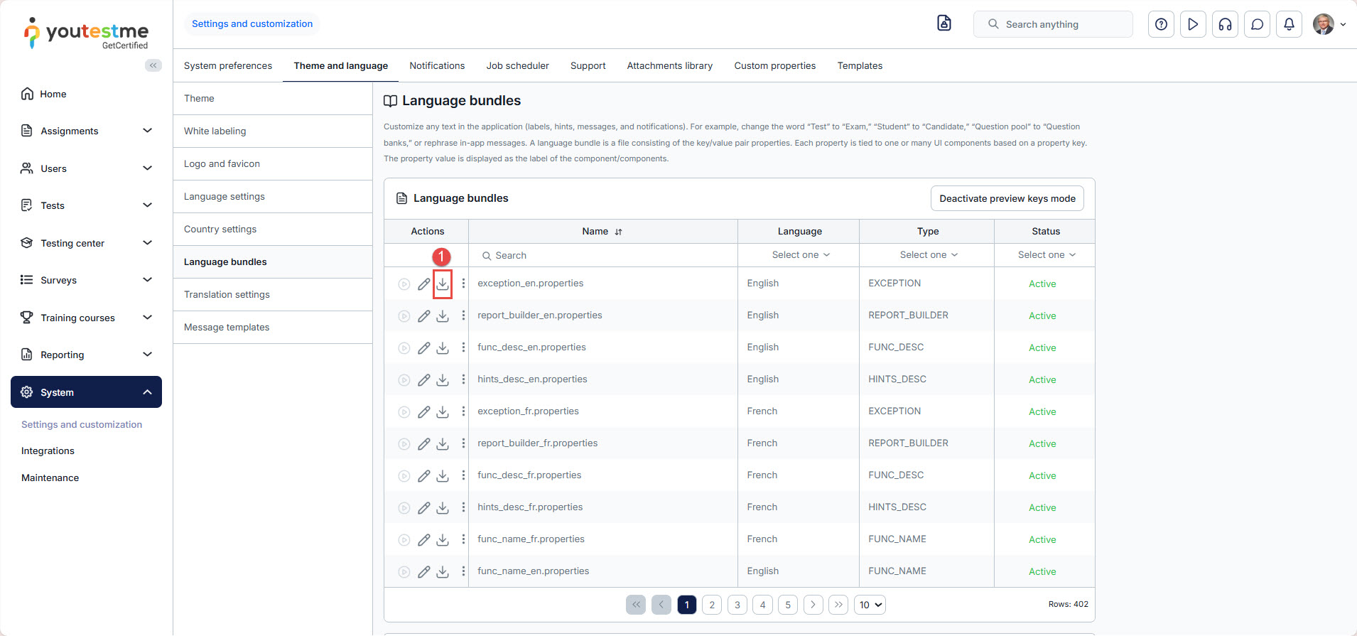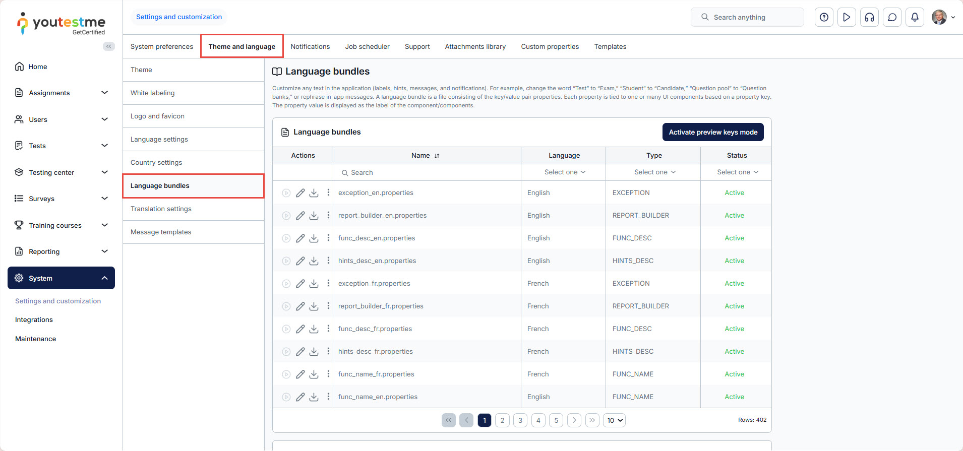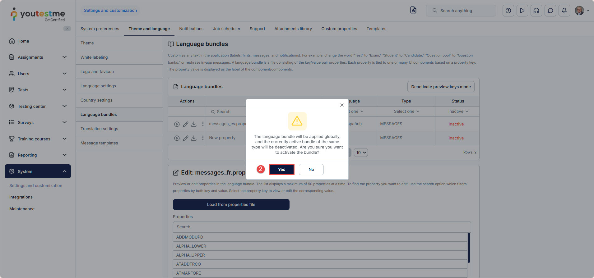 Note: Once you activate the language bundle, it will be applied globally, and the currently active bundle of the same type will be deactivated.