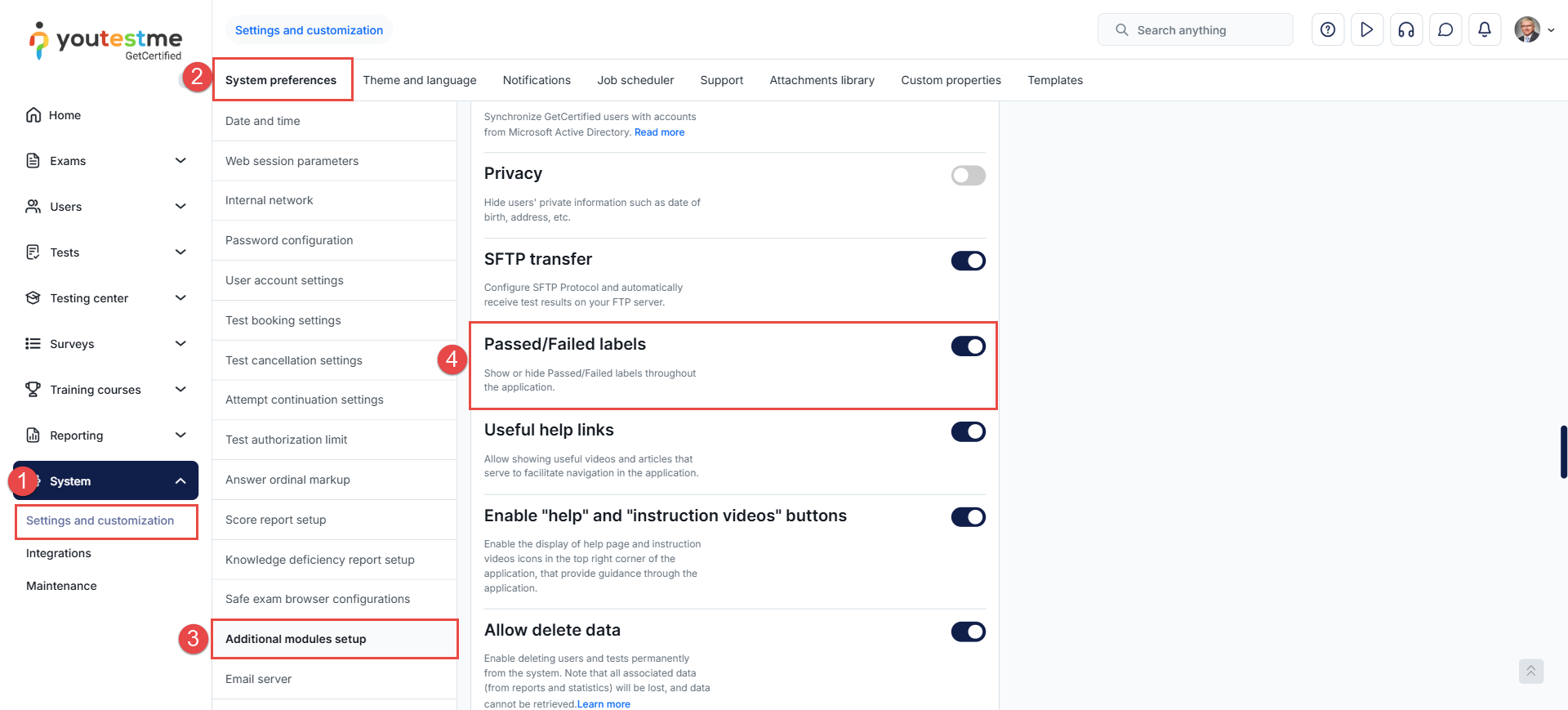 You can hide the Pass and Fail labels, allowing candidates to see only their score or just the grades they achieved. To hide the pass and fail labels, follow the steps below: