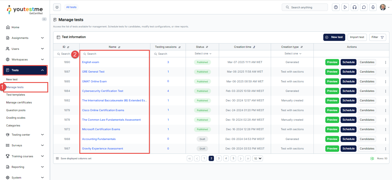 - Navigate to the Tests module from the main menu and select Manage Tests.