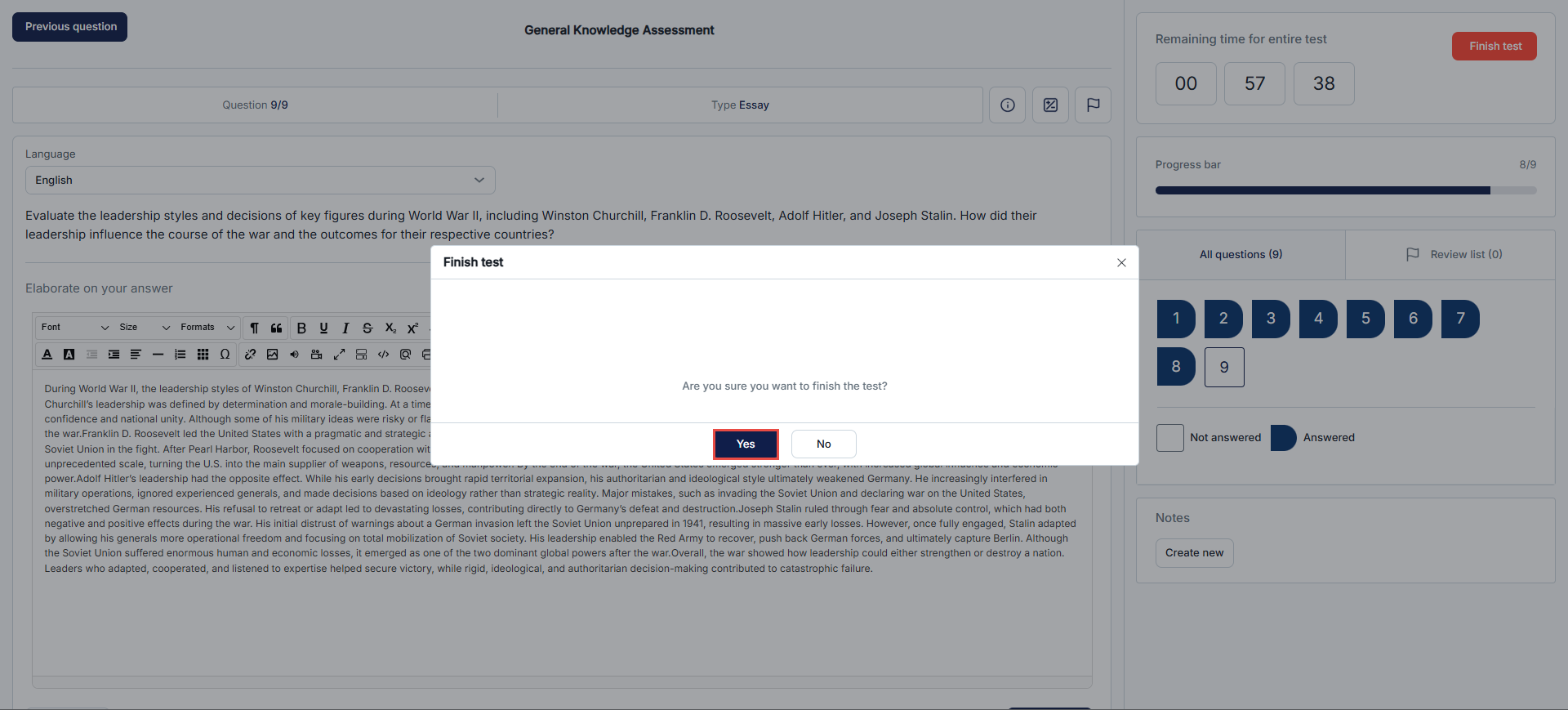 After answering all the questions, the candidate completes the test by clicking the Finish Test button at the end of the exam.