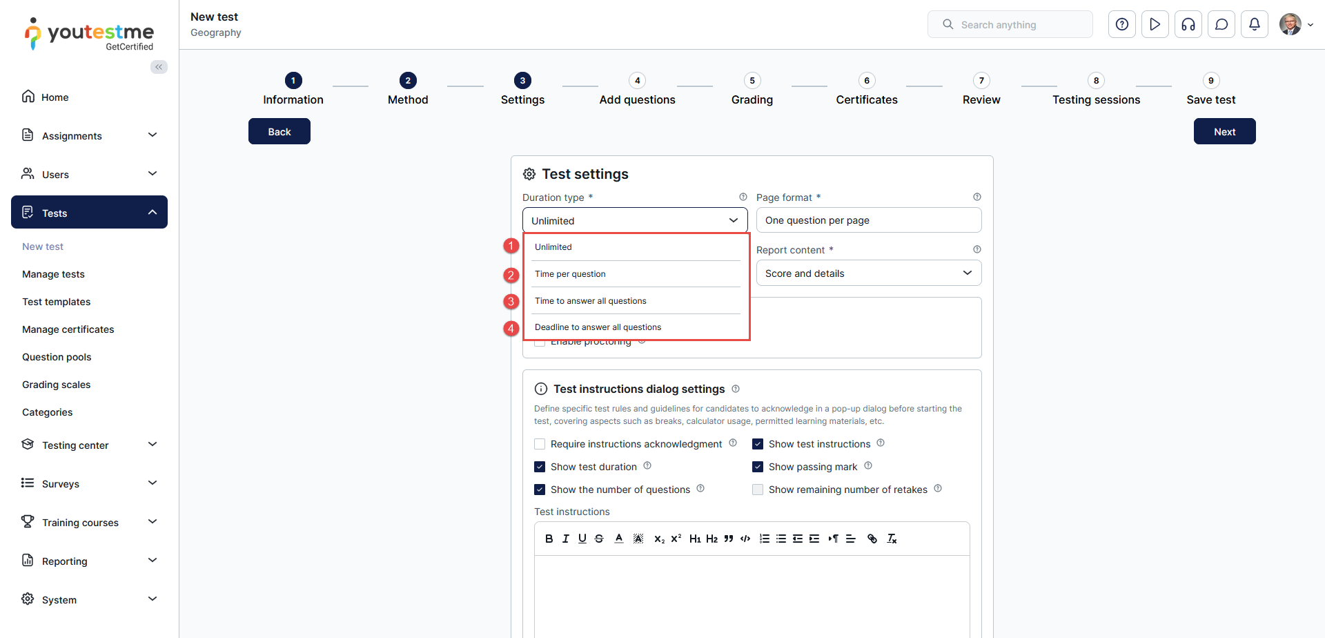 At the Test Settings step of the test creation process, test creators select the duration type from the Duration Type dropdown menu.