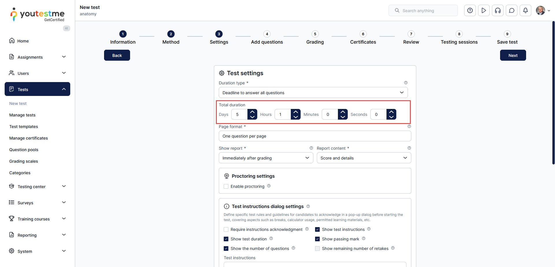 - Description: Test creators define the total duration for completing the test in days, hours, and minutes, allowing test-takers to allocate their time across questions as they choose.