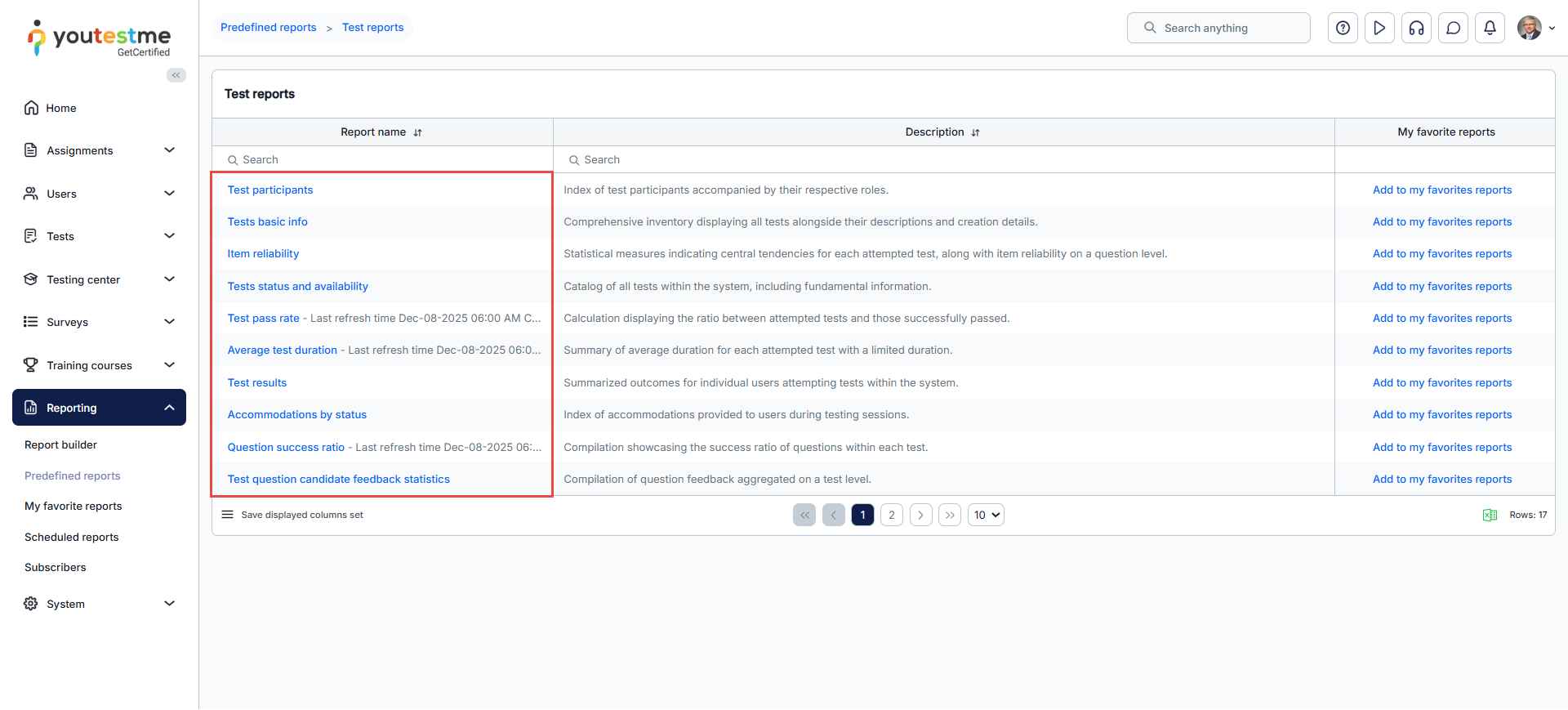 - When you access one of the report categories, you will see a list of all reports contained in that category, with their names, descriptions, and option to mark them as a favorite. To open the desired report, click on its name.
