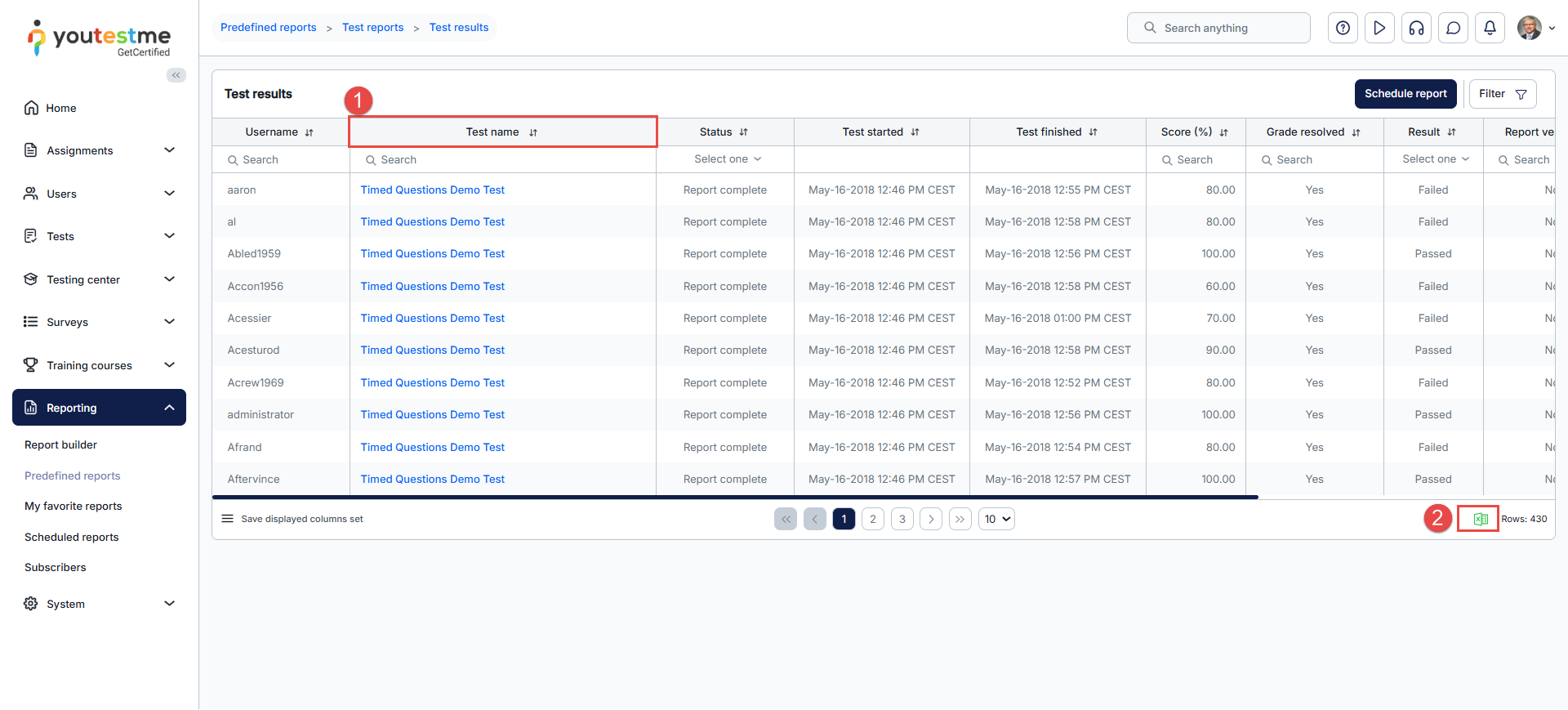 - For example, we accessed the “Test results” report. This report displays the list of candidates, tests, time of starting and finishing tests, score achieved by each candidate, outcome, etc.