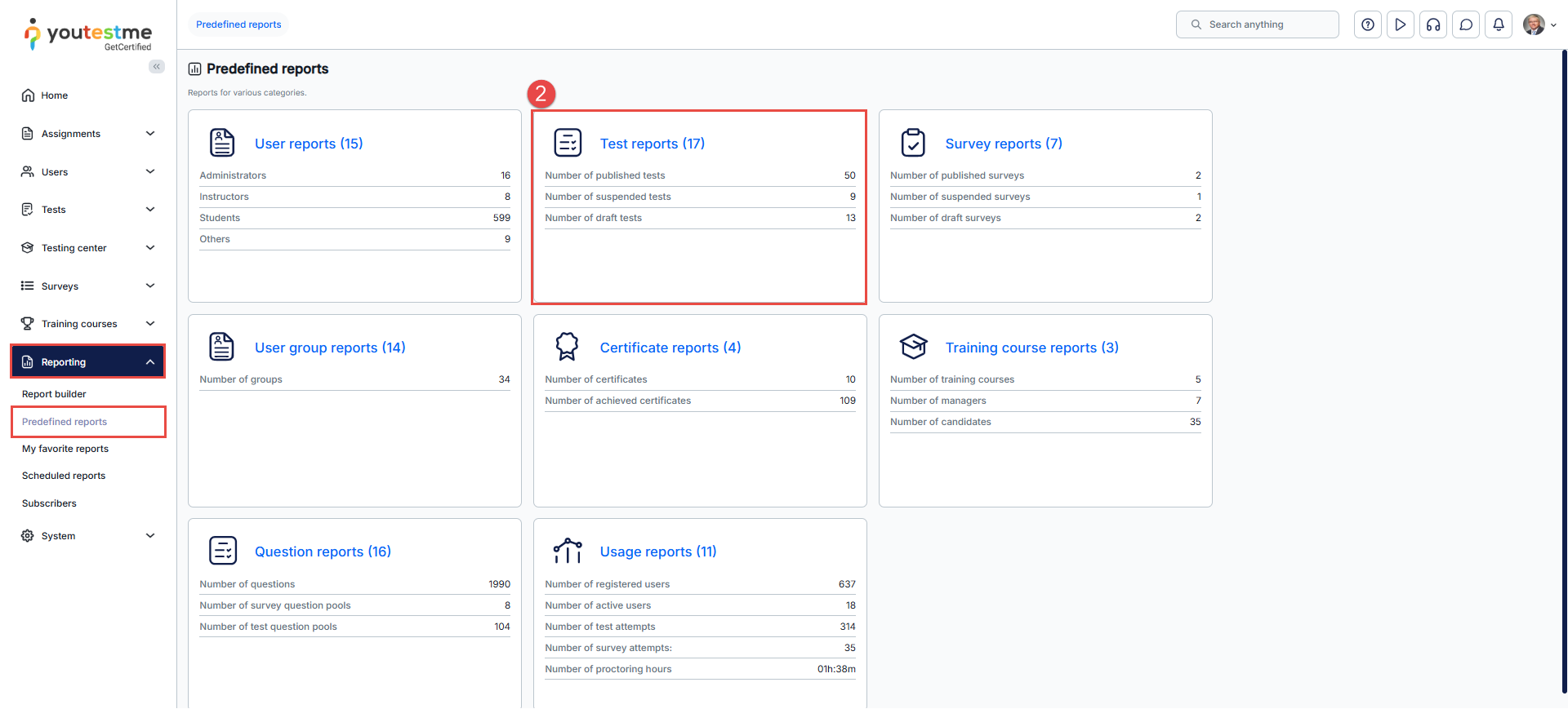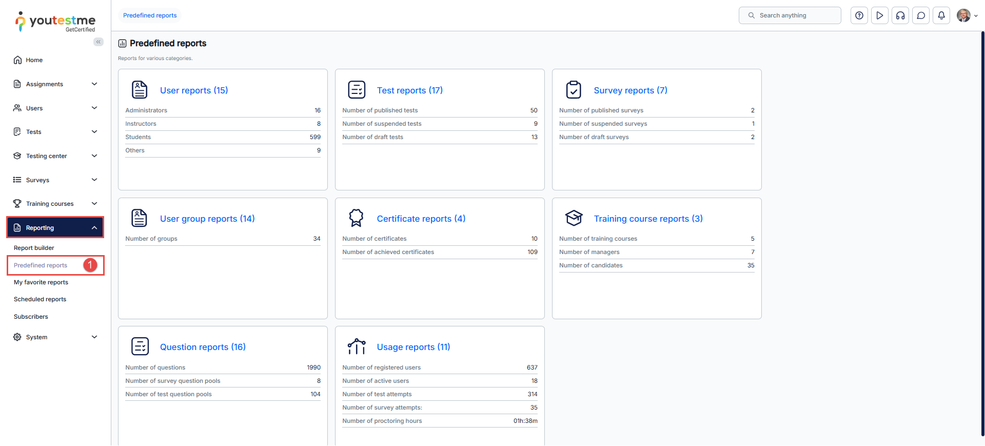 - To access the predefined reports, hover over the “Reporting” section in the main menu, and select “Predefined reports” .