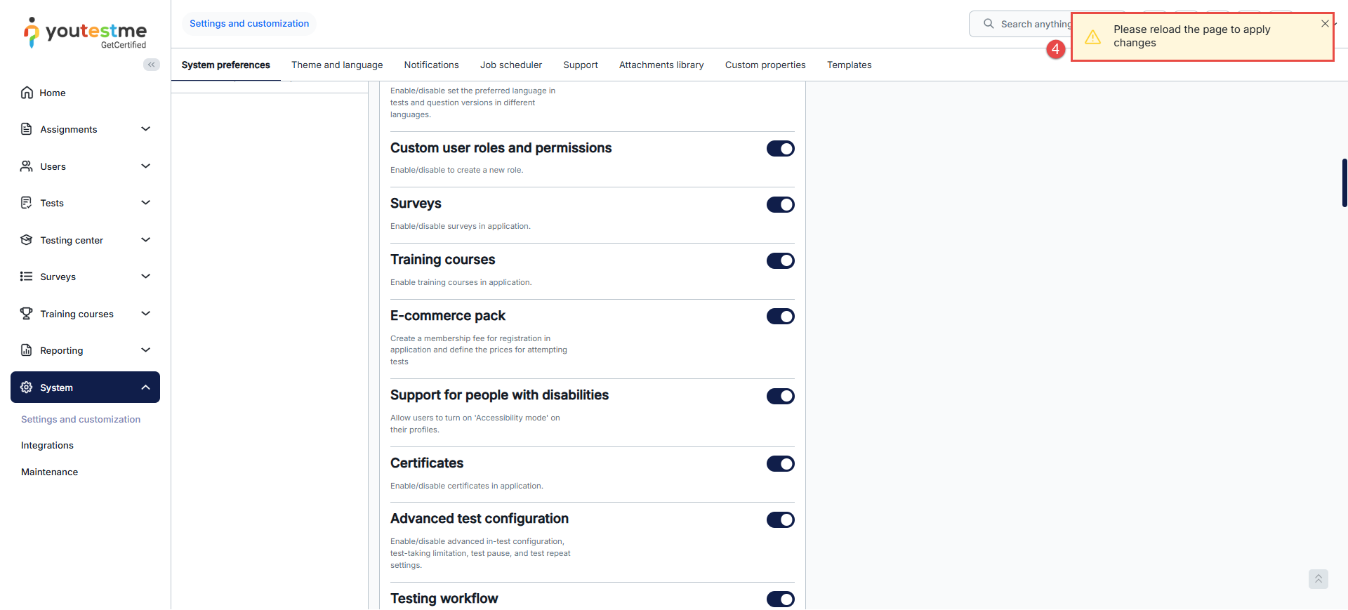 - After enabling the option, you will receive a system notification to reload the page.
