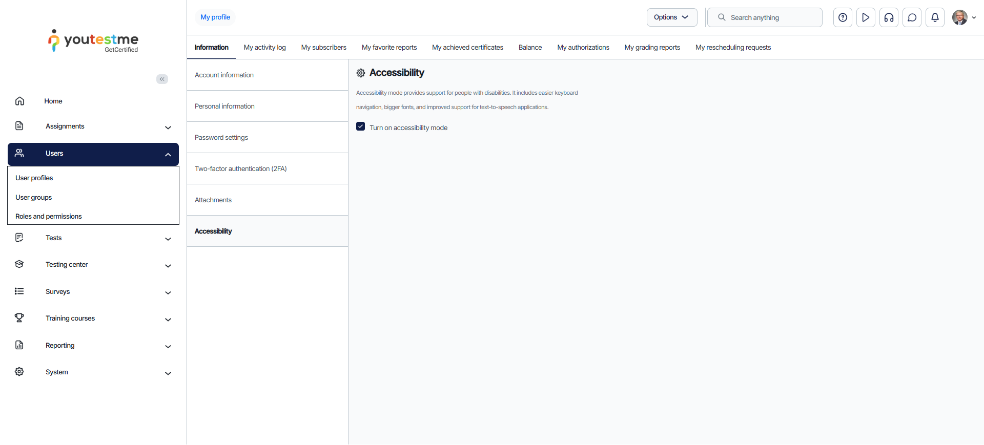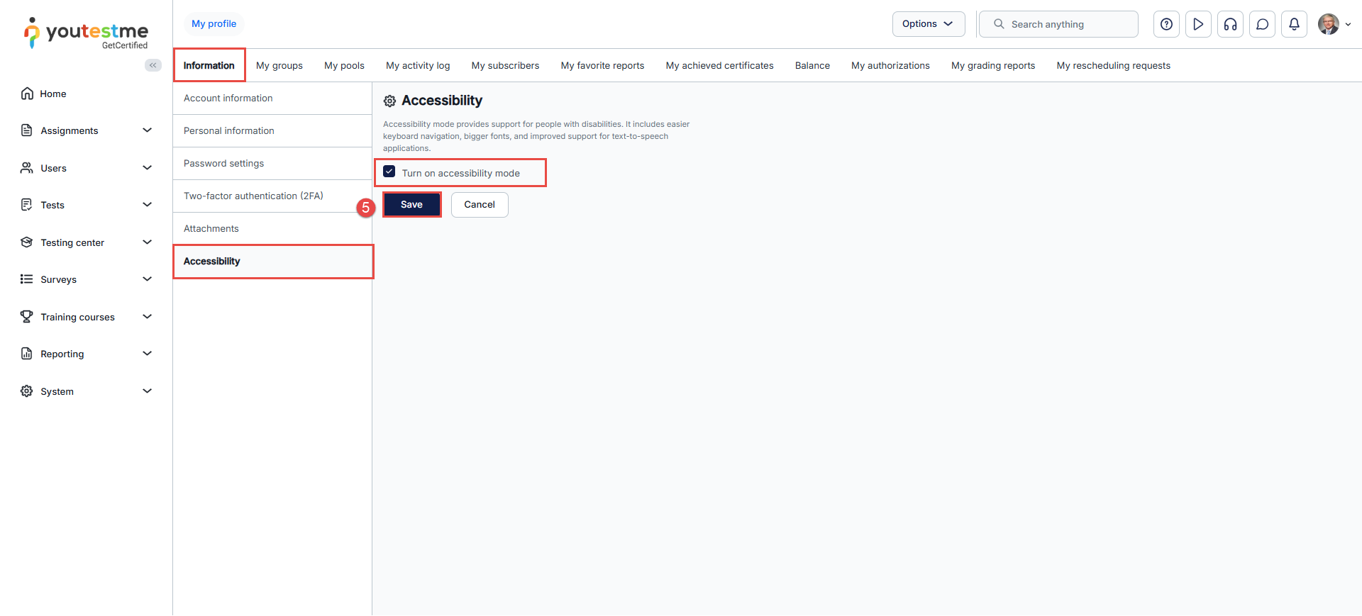 - After navigating to My profile, you will see the tab Accessibility. Tick the box to enable accessibility mode, then save the changes.