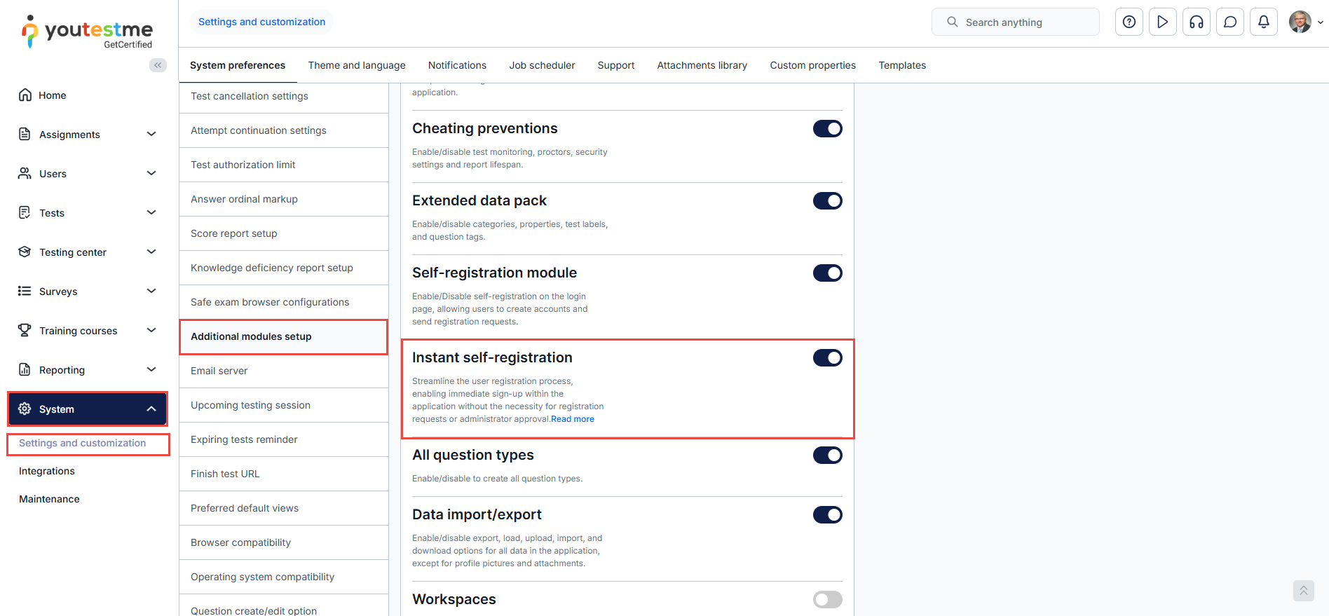 To enable the Instant self-registration module, go to the System section in the left-hand menu, select Settings and Customization, and navigate to the Additional Modules tab. Here, activate the self-registration module by toggling the corresponding button. Once enabled, the Instant self-registration option will appear and can also be activated by clicking its toggle. To disable it at any time, toggle the button off.