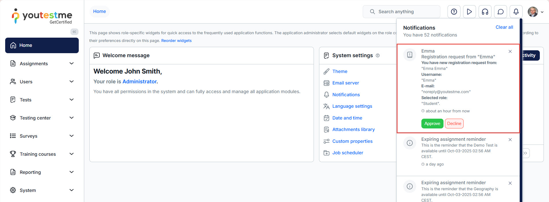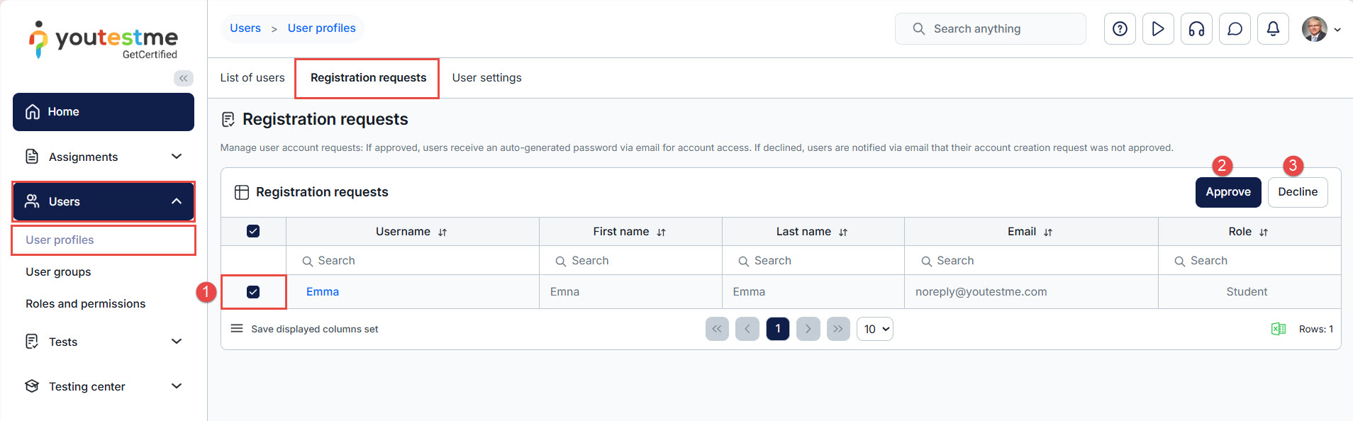 - Decline – to decline the registration request and prevent the user from becoming a student.