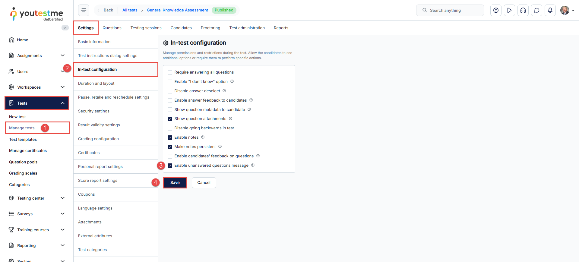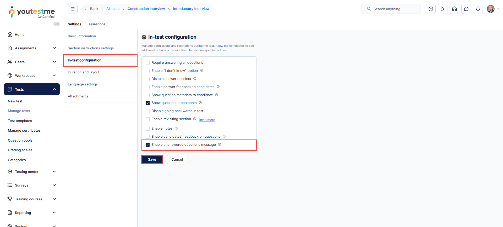 - In the In-test configurations section, you’ll see various options for the test’s behavior and features. Look for the Enable unanswered questions message checkbox. Check this box if you wish to utilize this feature.