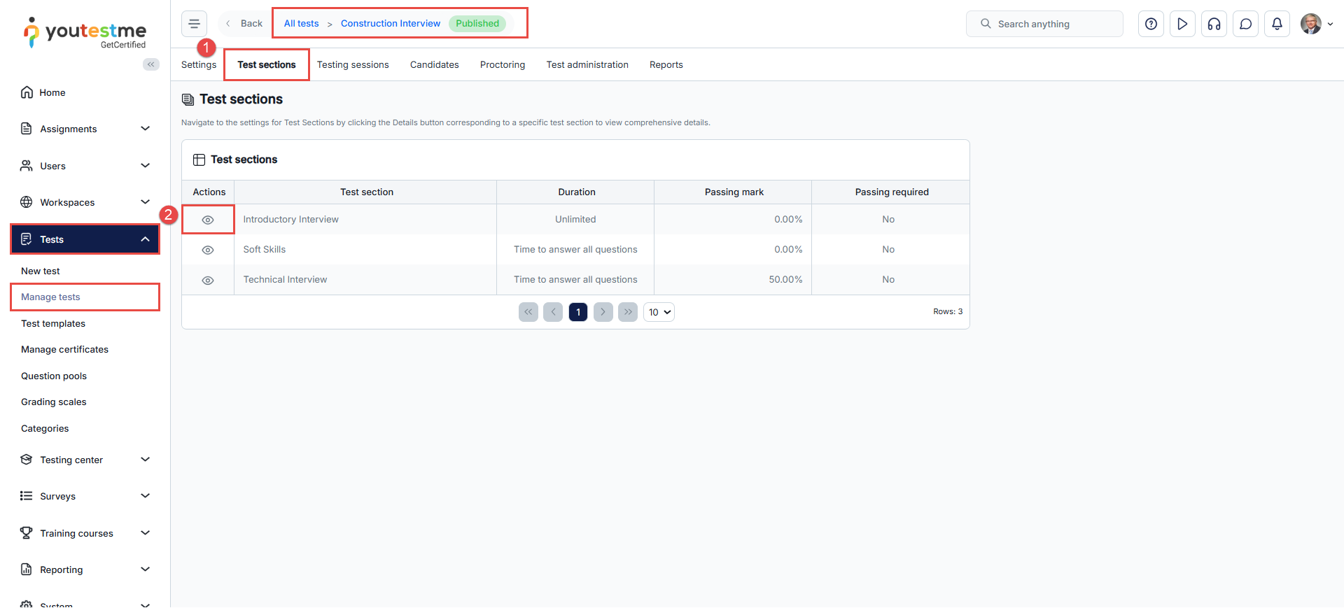 - Navigate to the Tests/Manage Tests tab. Locate the test for which you want to enable the feature. Click on the test’s name to enter its specific settings. This is possible for both published and draft tests.
