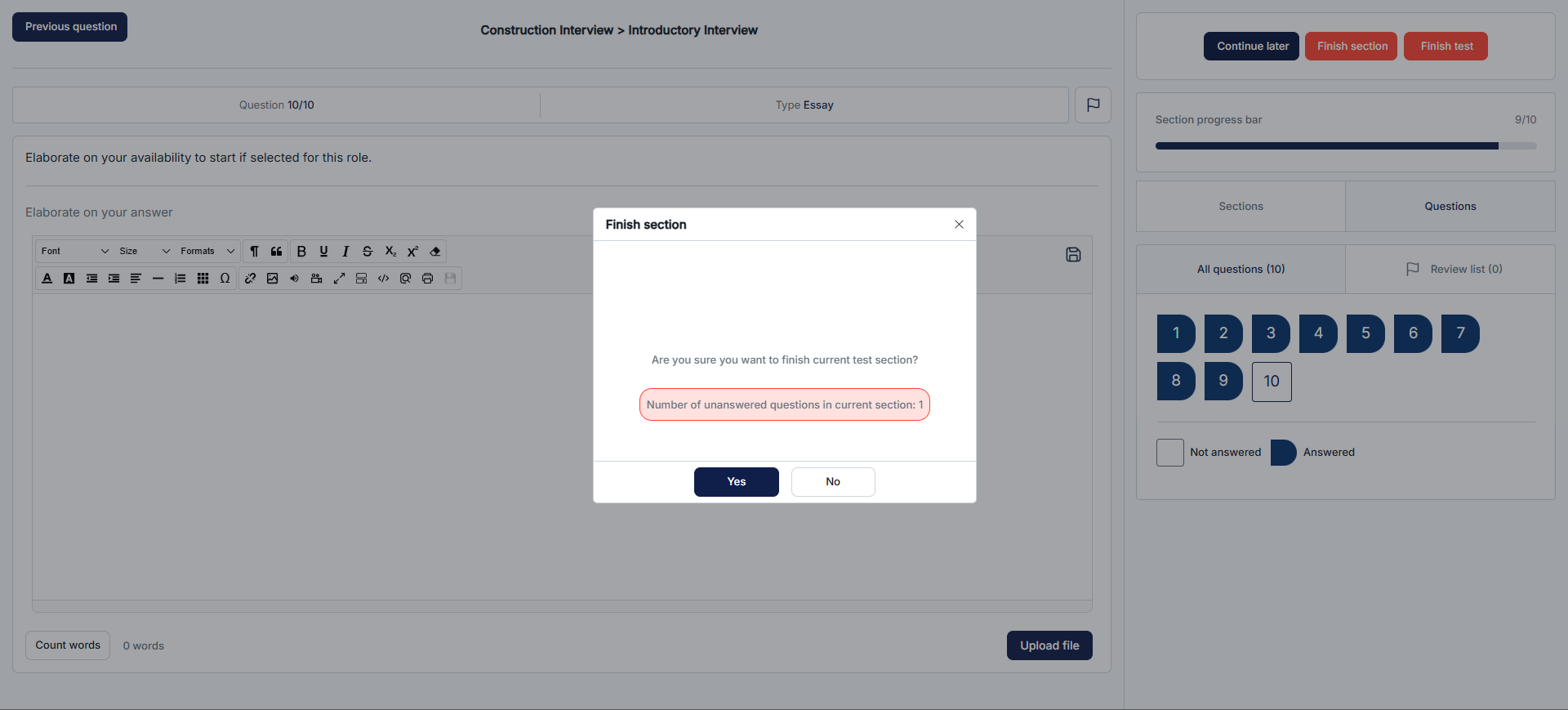 From the candidate’s perspective, the Unanswered questions message feature provides valuable clarity during the test-taking process. When this feature is enabled, the test taker will receive a message showing the total number of unanswered questions when they click the Finish test button. This immediate feedback empowers candidates to identify and potentially answer missed questions before submitting their test.