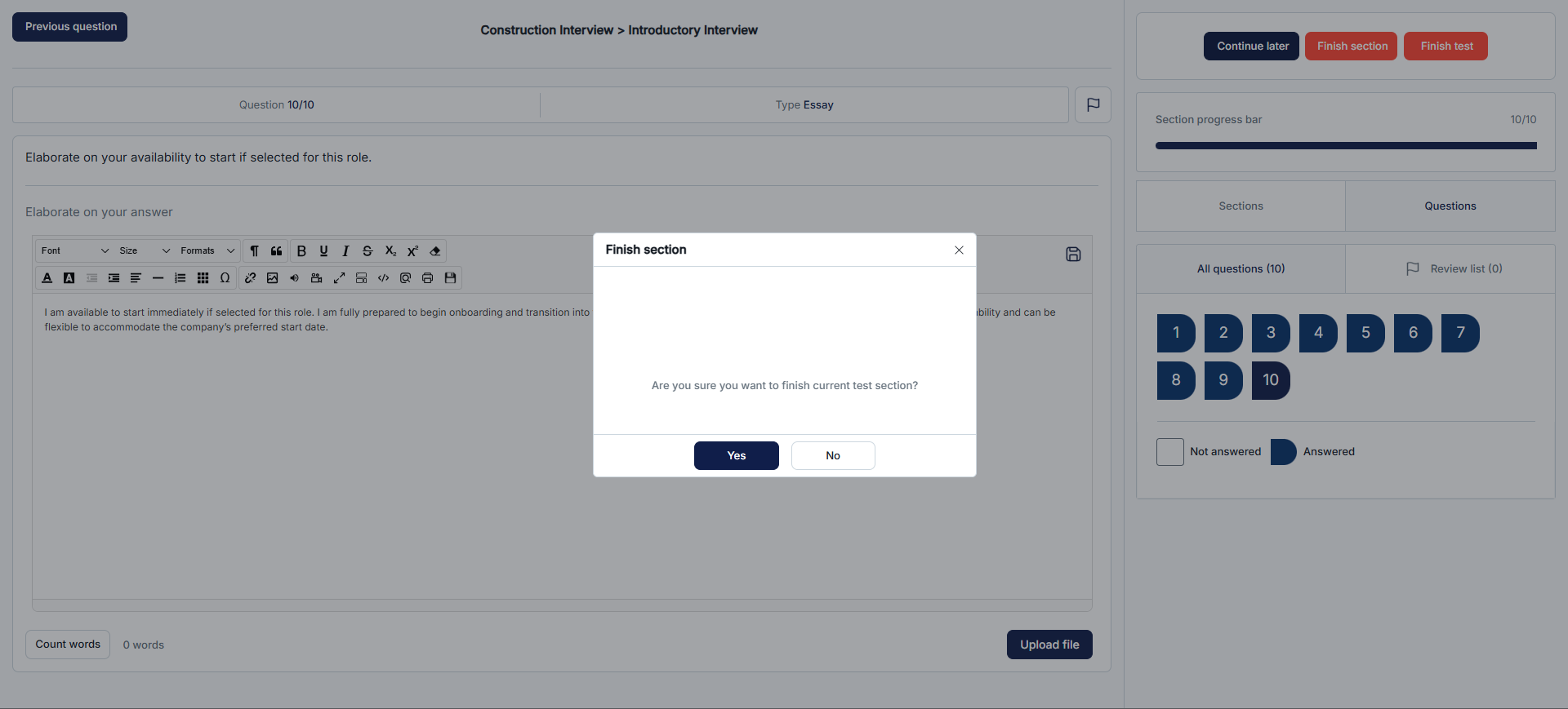 Conversely, when the feature is disabled, clicking the Finish test button will prompt a simple confirmation message asking whether the test taker wants to conclude the test. While this streamlined approach lacks the unanswered questions count, it maintains a straightforward experience for those who prefer not to receive additional notifications.