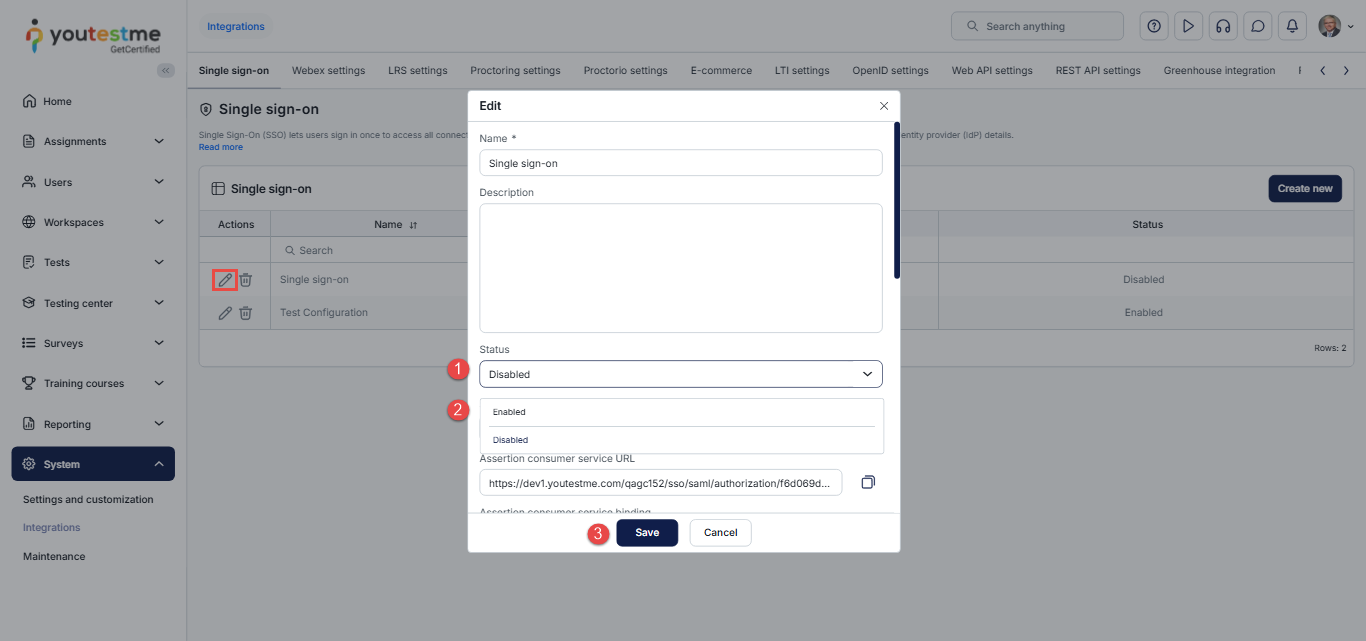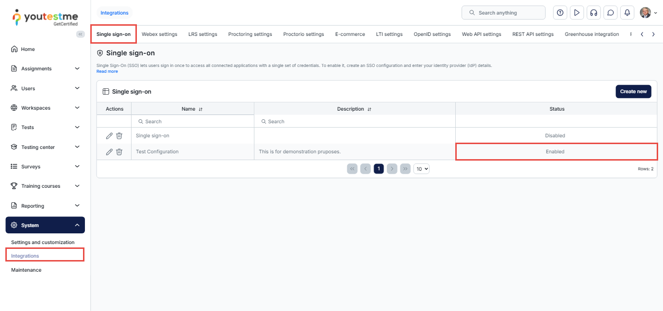 - In the Single Sign-On (SSO) tab, verify that the SSO configuration status is set to Enabled.