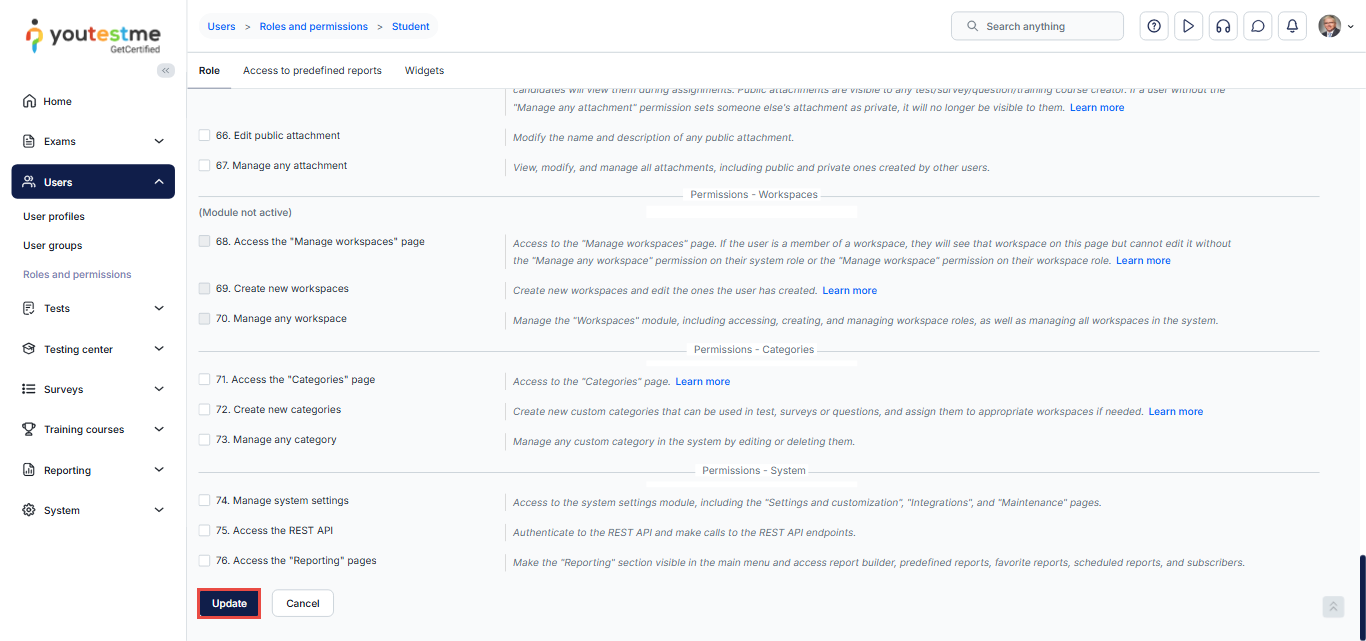 Apply the changes by clicking the “Update” button found at the bottom of the “Roles and permissions” tab.