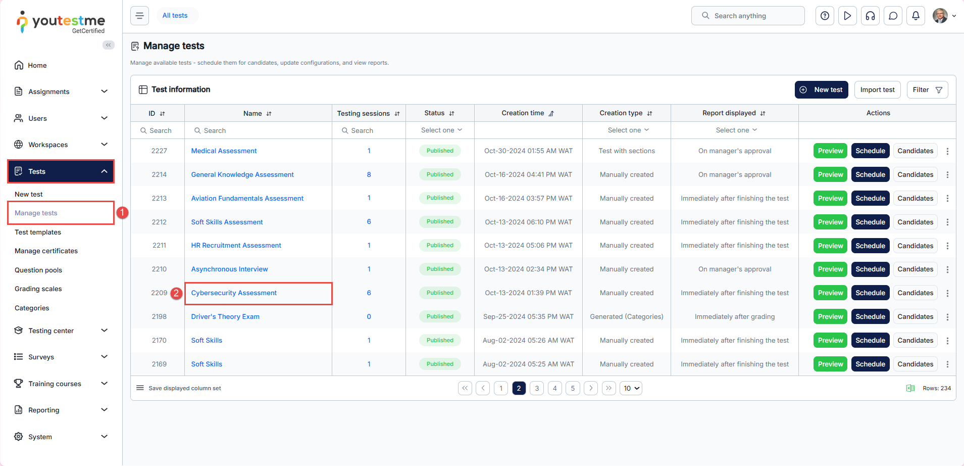 - Hover over the Tests tab in the main menu. Click on the Manage Tests tab