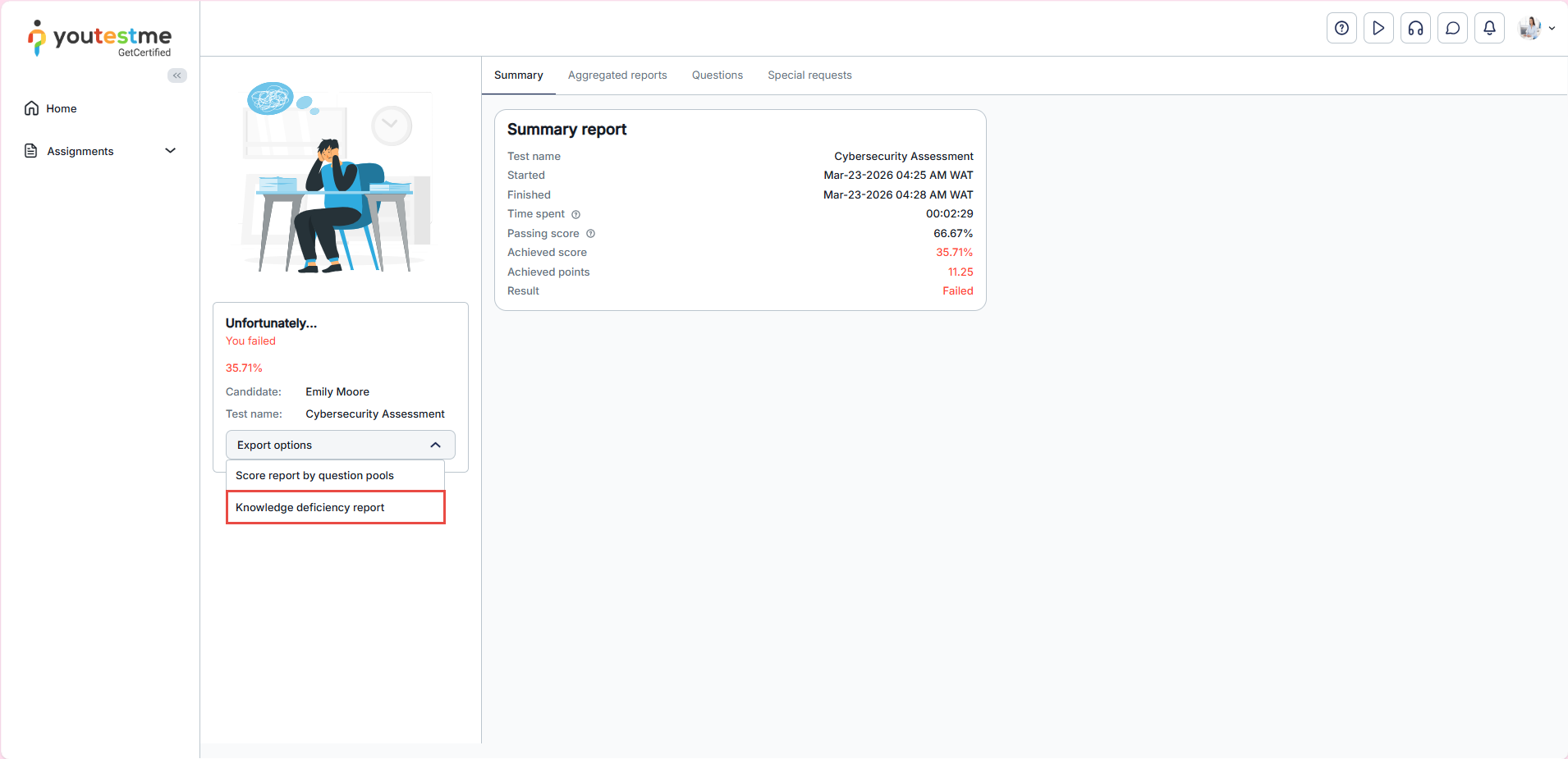 When a candidate finishes the test, in their Personal report, the Export button option should appear, offering all enabled reports for downloading. Among them, the Knowledge Deficiency Report will be listed.