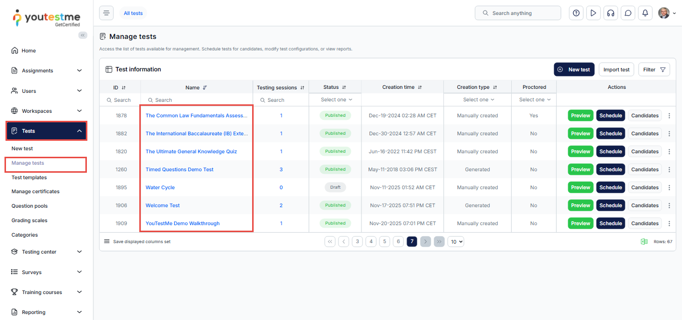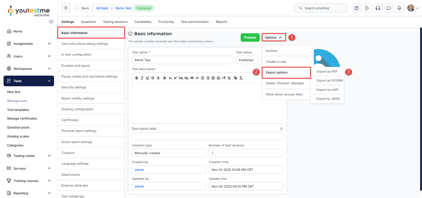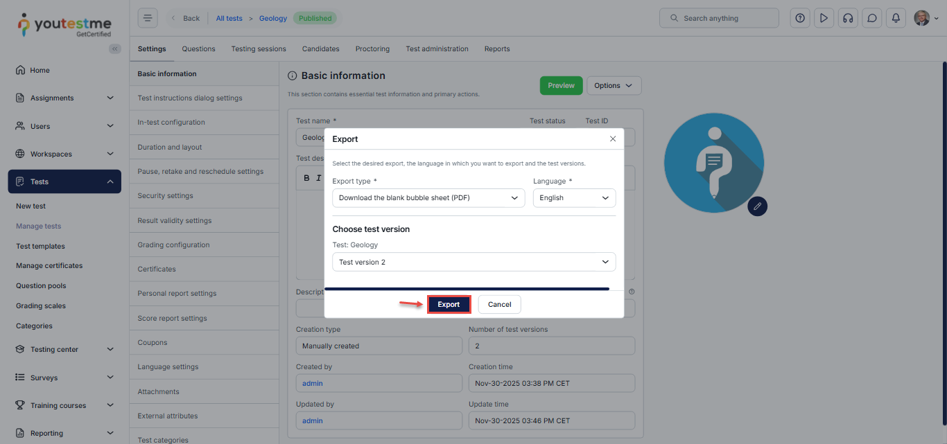 To access the page, choose the Tests/Manage tests tab, and then select the specific test you wish to export as a PDF.