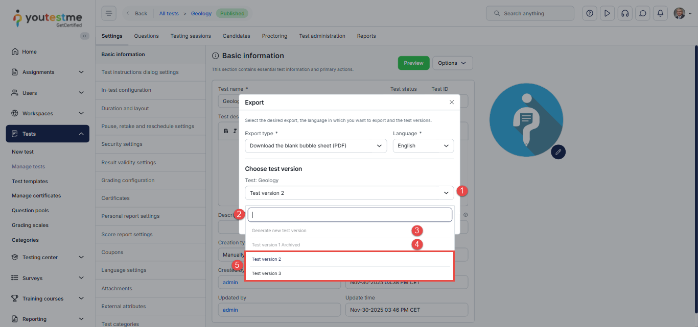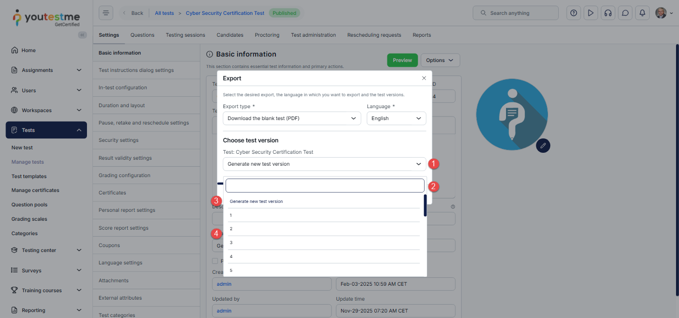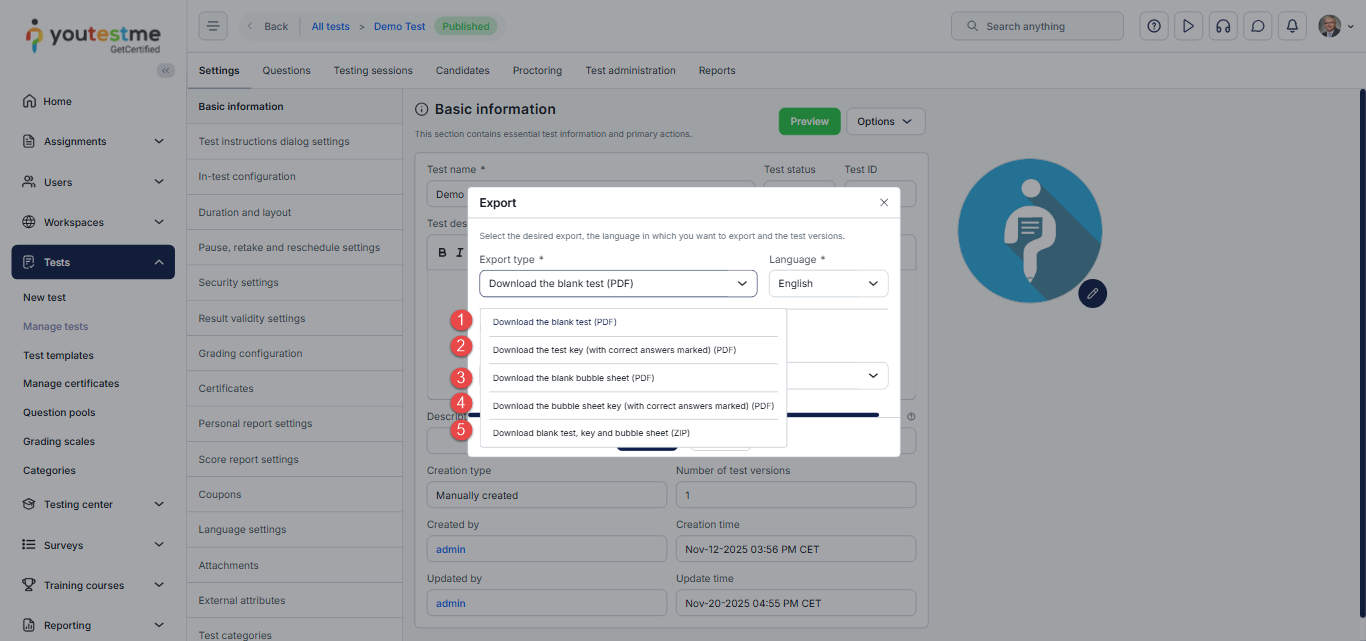 After selecting the preferred test and choosing the option to export the test as a PDF file, you will be provided with the following options: