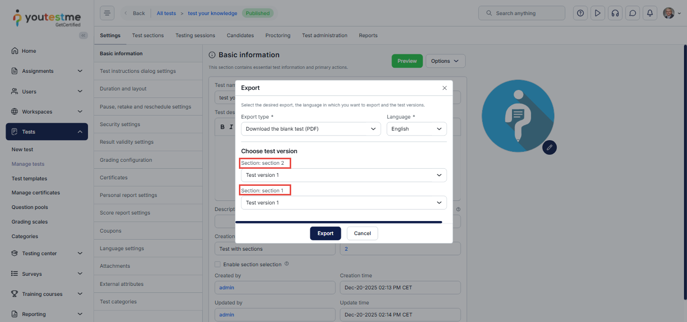 In the “Choose Test Versions” part of the dialog, multiple fields will be displayed, each corresponding to a specific section of the test. You can select a test version for each section by following the steps outlined in the chapter on Exporting Test Versions of this article.