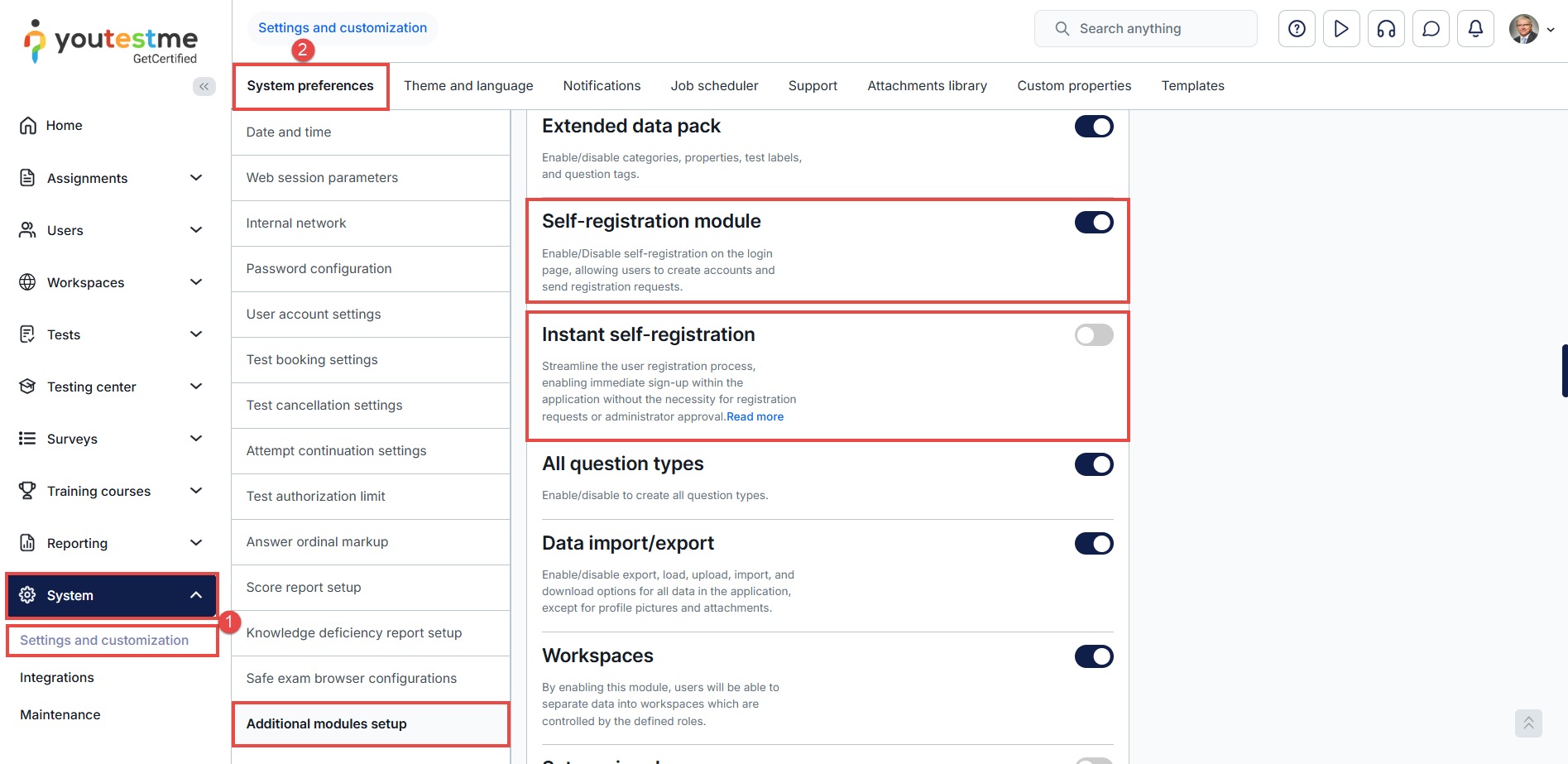 - Enable the Instant self-registration module for immediate sign-up without registration requests or administrator approval.