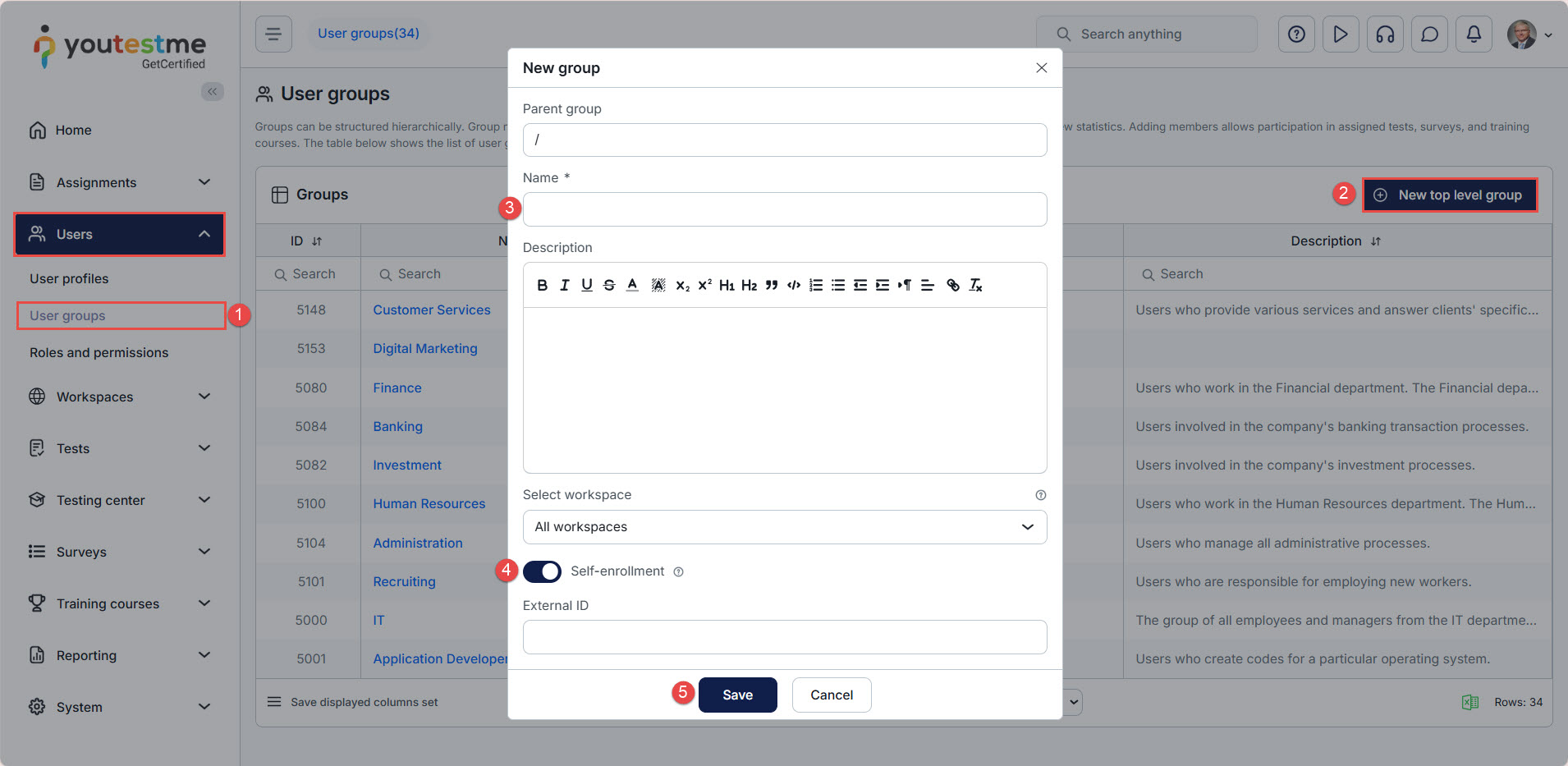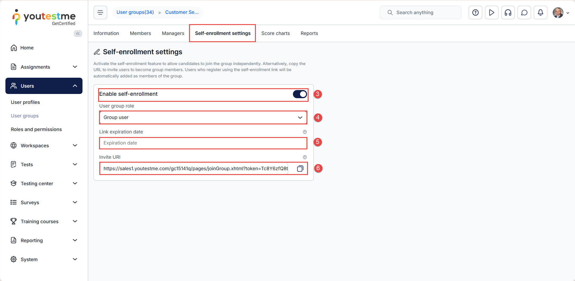 To enable the self-enrollment option for user groups and allow direct access to the group via a link, follow these steps: