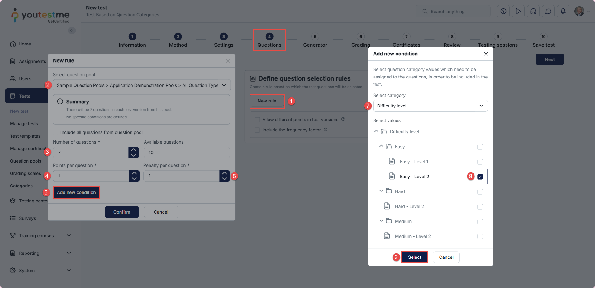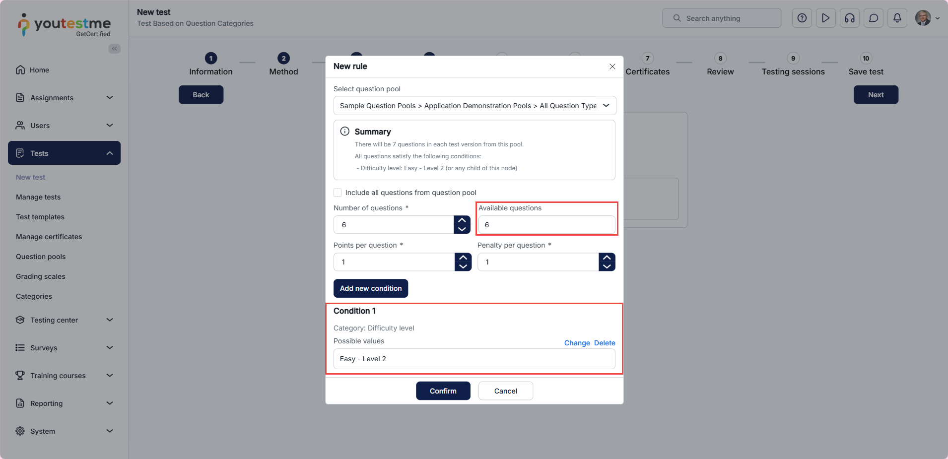 You will be presented with the number of available questions containing the defined condition. Once the condition is added, you will receive an in-app notification. Click the Confirm button to create a test rule. You can repeat the steps from 1 to 9 to define more test rules.