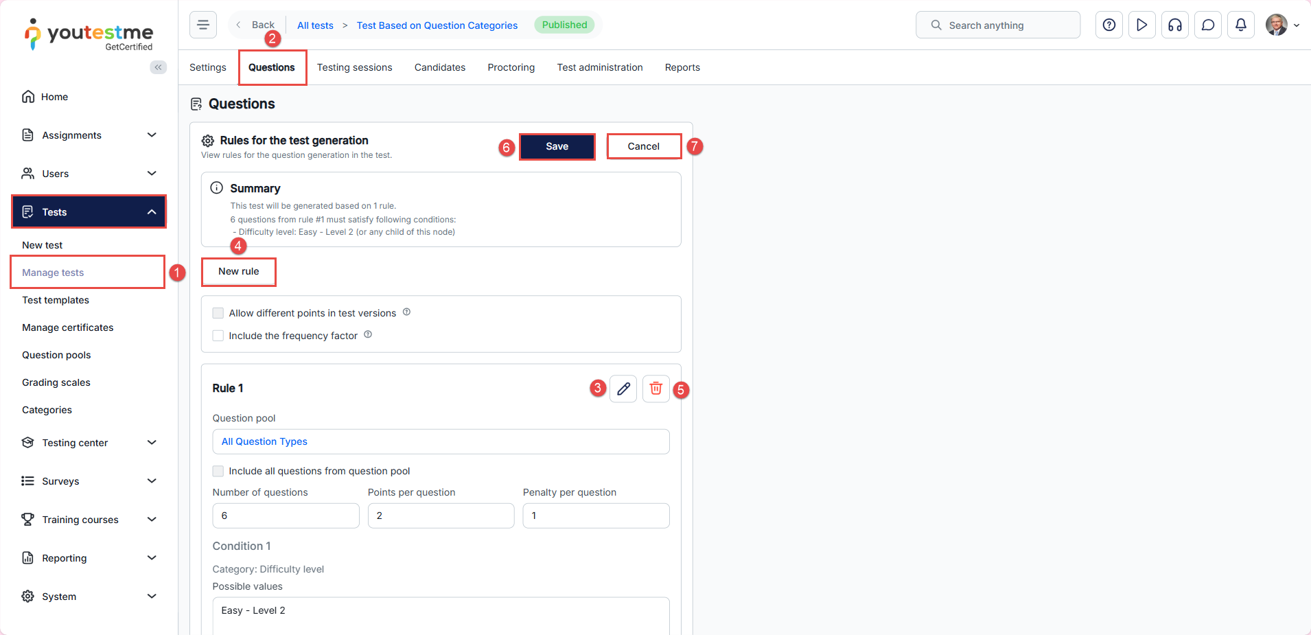 - Click the Edit icon to modify an existing rule. Update the question pool, number of questions, points, penalties, or category conditions as needed.