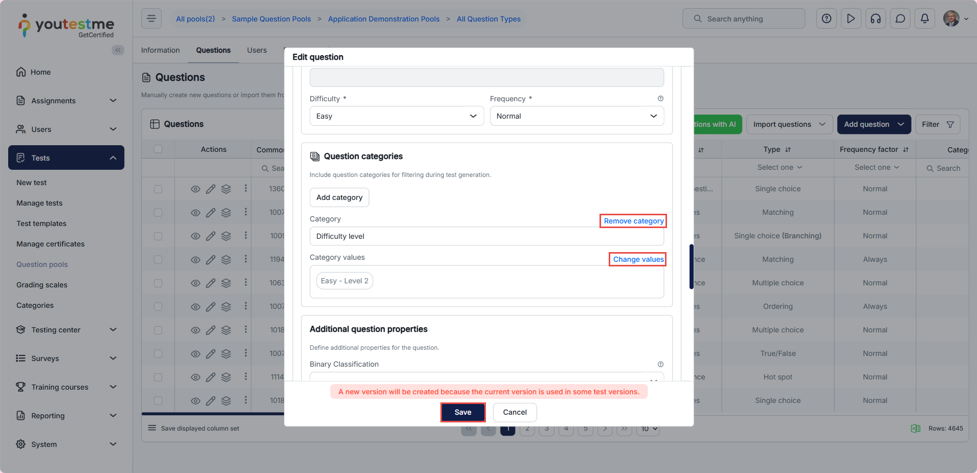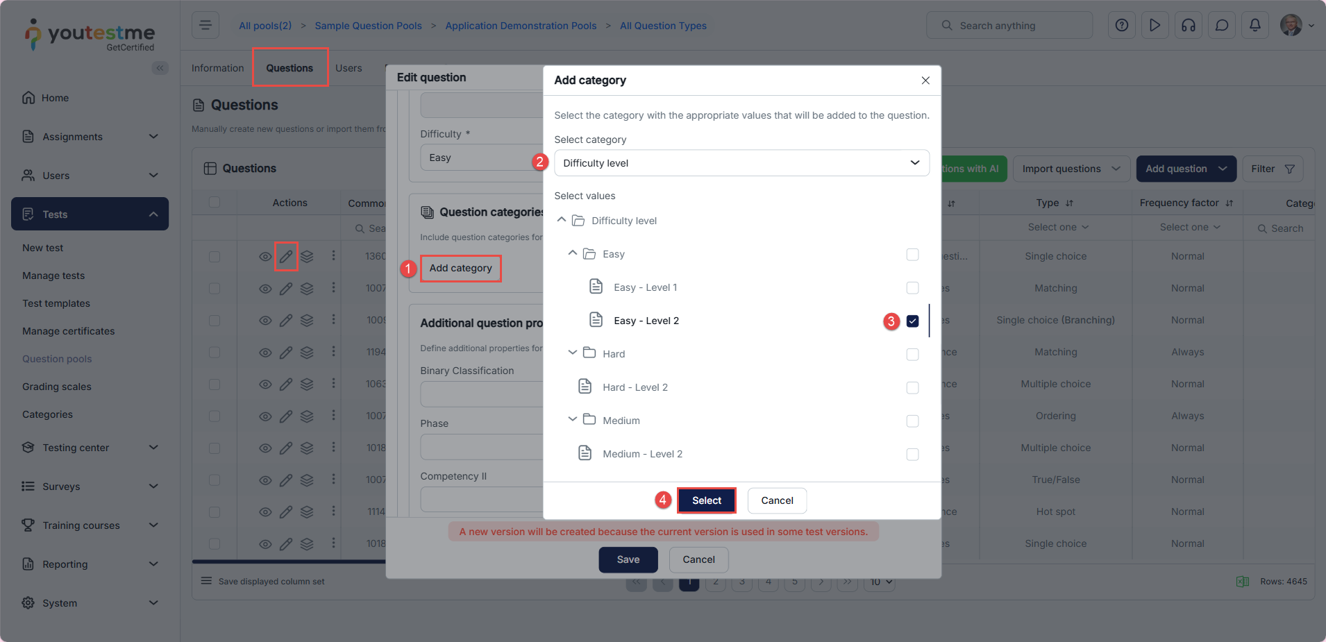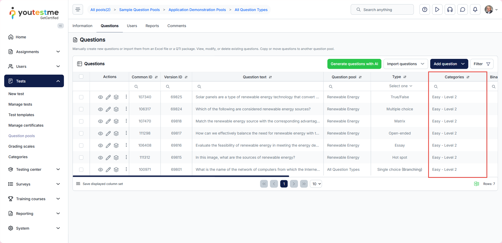 - Select the desired values of the question category, which will be used for filtering in test generation.