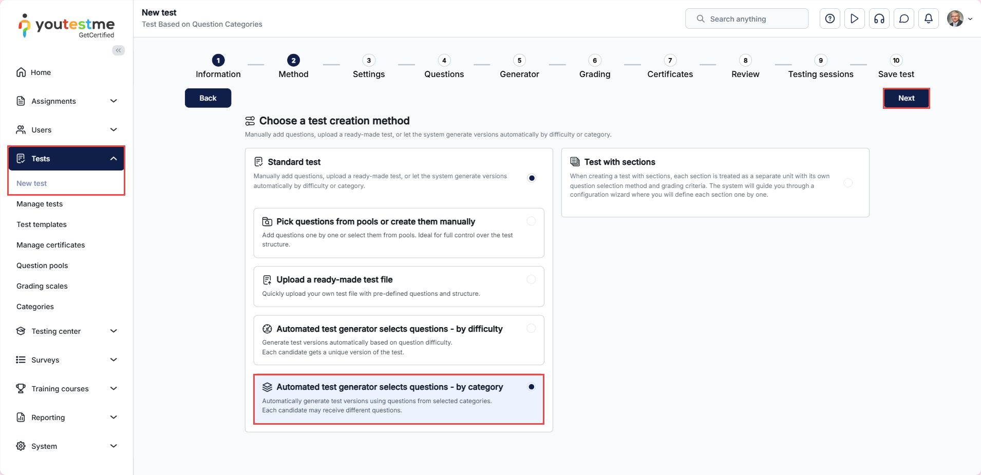 In the second step of the test creation wizard, select the Based on Question Categories method and click Next.