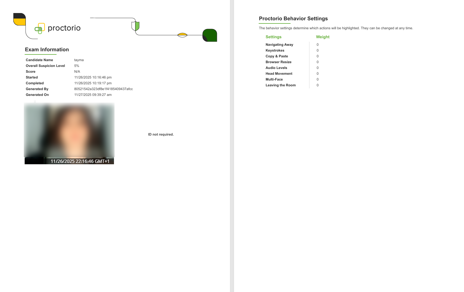 - Screen Recording – Provides a full recording of the candidate’s screen during the exam. Depending on the Proctorio configuration, this may include screenshots, monitor detection, or other desktop activity logs.