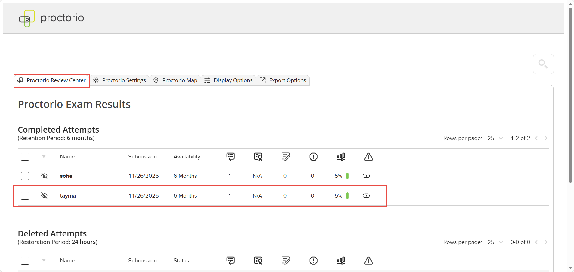 After clicking the camera icon, the Proctorio Gradebook will open in a new browser tab. This page displays all candidates who completed the selected test along with key monitoring details, such as submission time and suspicion level.