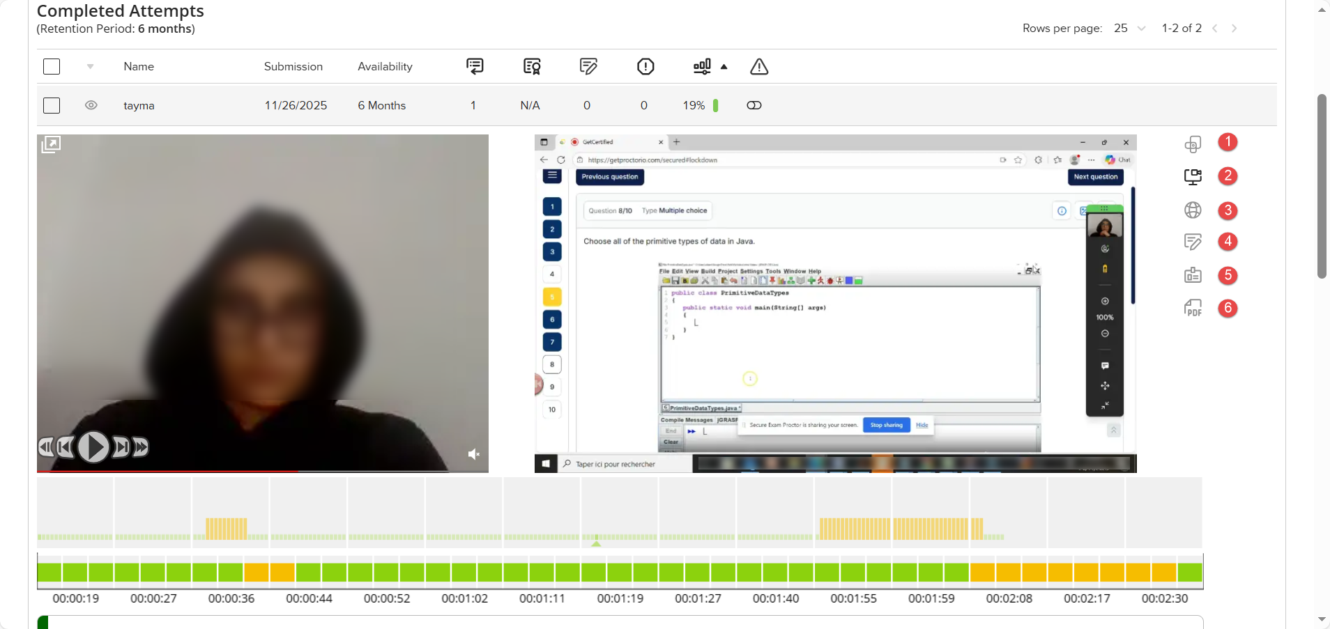 In the review interface, you can access several monitoring and verification tools. Each option opens a detailed panel related to the candidate’s exam session.