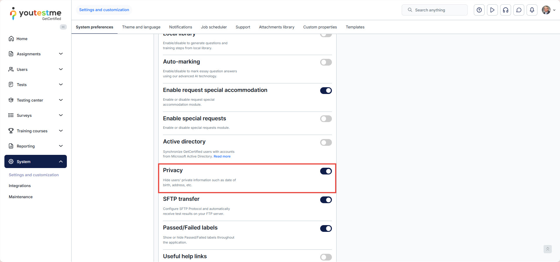 YouTestMe GetCertified lets you choose whether users’ private data should be visible. To hide the users’ private information, you should: