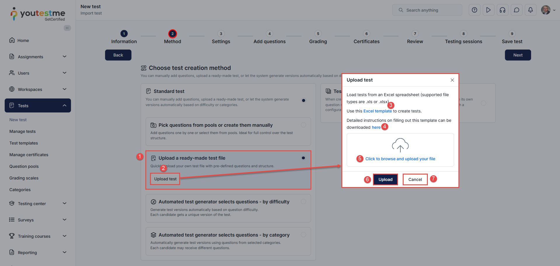 To upload a test using an Excel file, follow these steps in Step 2 – Method of the Test Wizard: