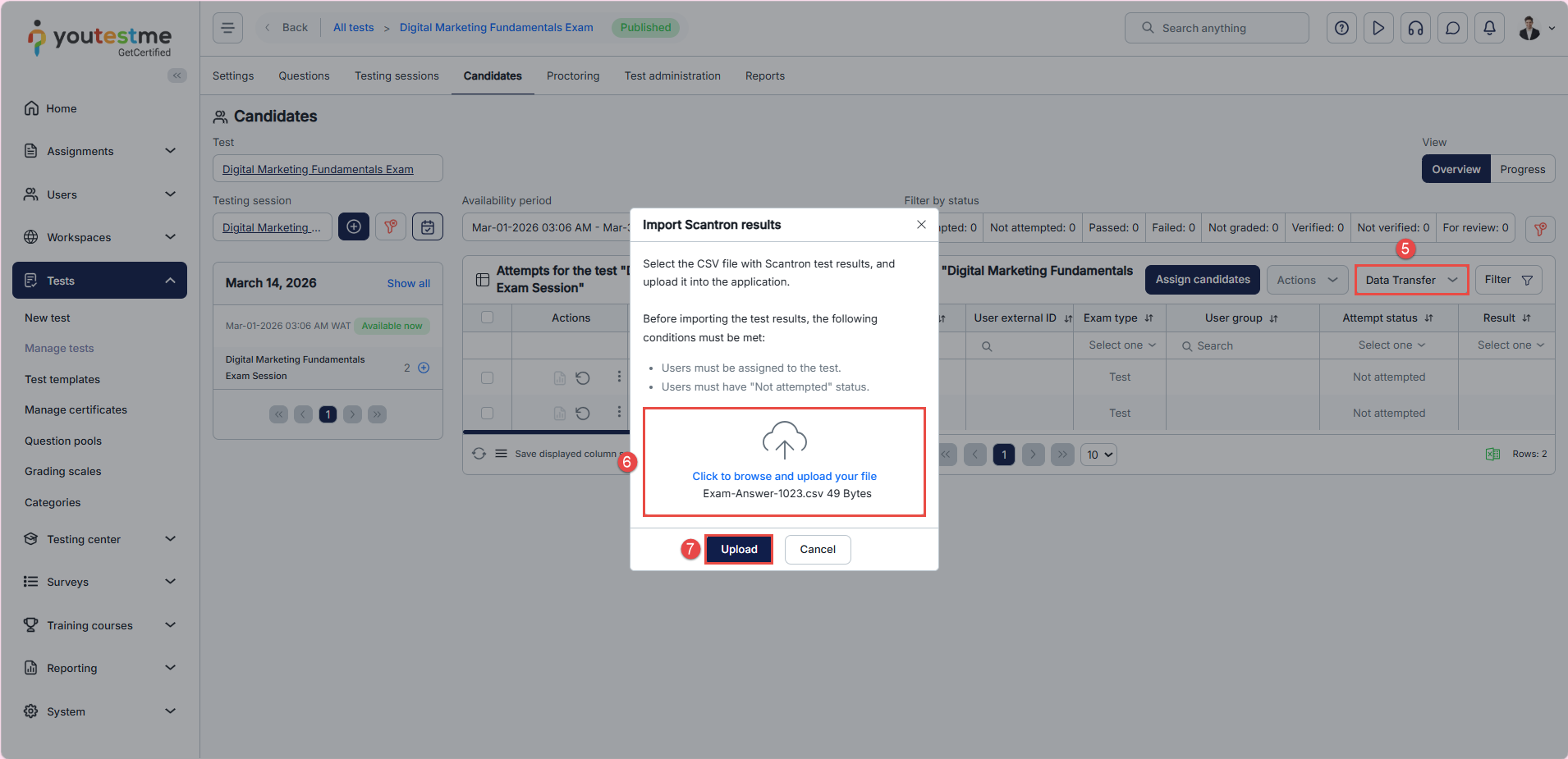 This article explains how to import tests that students completed offline into the application. With YouTestMe GetCertified, you can generate tests for offline use, print hard copies, and after students complete them, enter the test attempts back into the system. Test attempts will be automatically graded, just like tests conducted online.