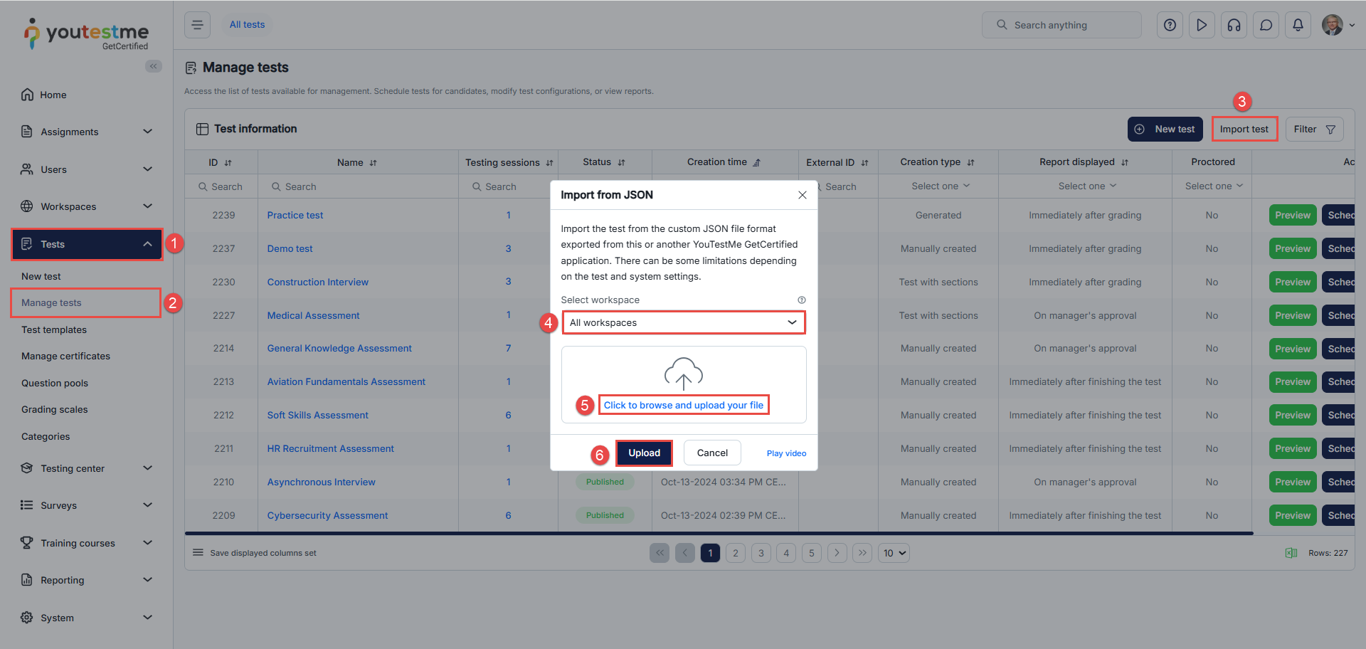 This article explains how to import tests as JSON in YouTestMe. This feature allows quick addition of pre-made tests or seamless migration of tests from other systems, saving time and ensuring consistency across assessments. Using JSON maintains the structure of questions and answers while enabling easy transfer or sharing of tests between different platforms or environments.