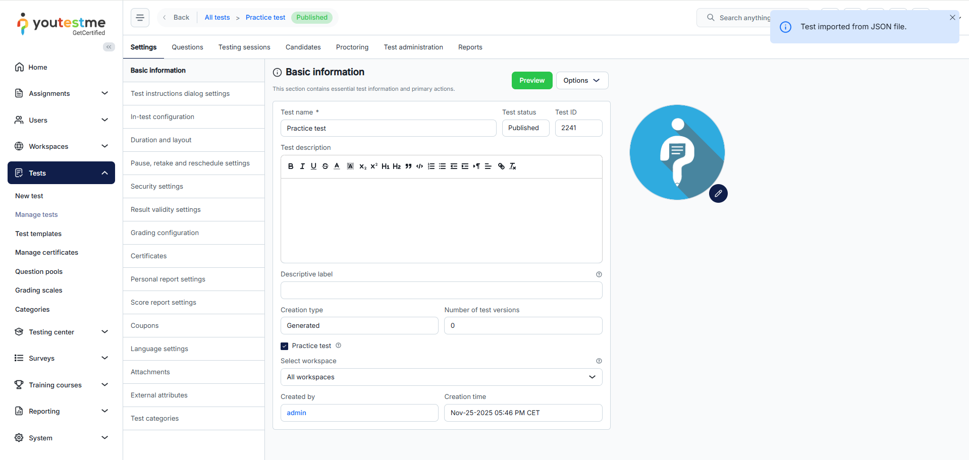 After clicking the Upload button, the system imports the test and redirects to the test management page, where the test content and configuration settings can be modified.