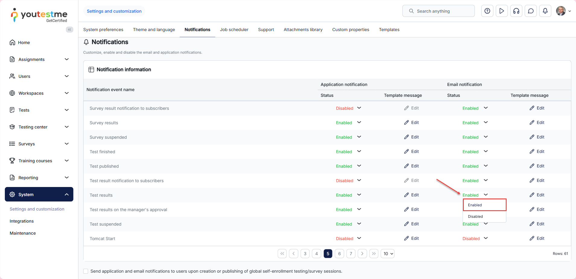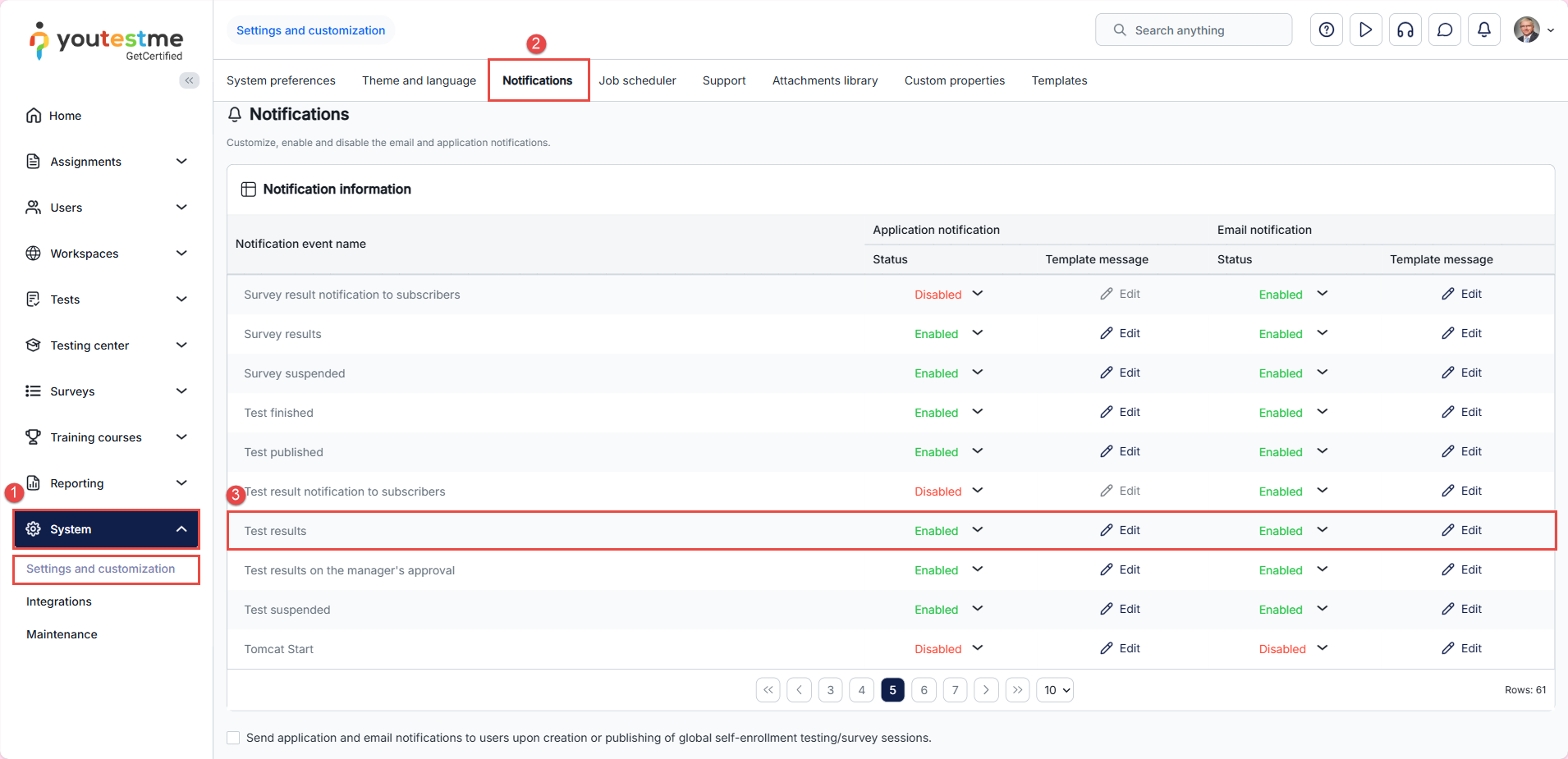 3. Find the Test results notification and click on the Edit option in the email notification column.