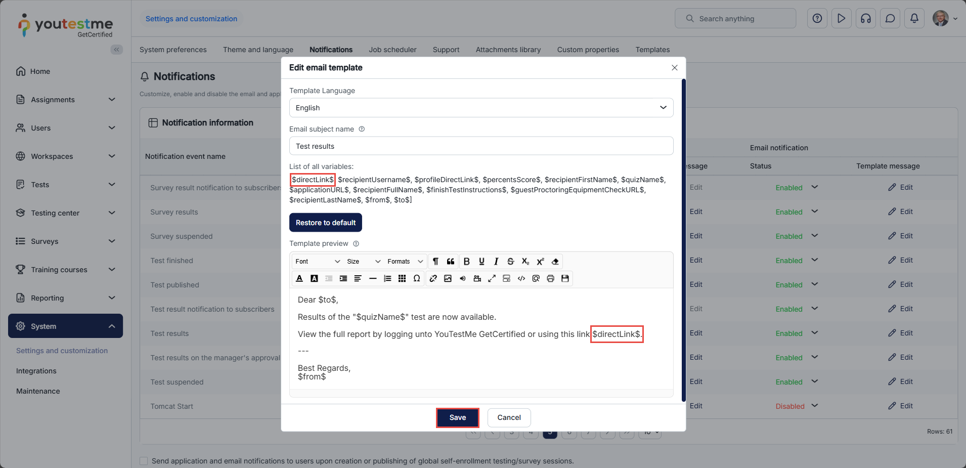 Include the $directLink$ variable in the email notification template, make the necessary adjustments, and then click the “Save” button to save the modifications.