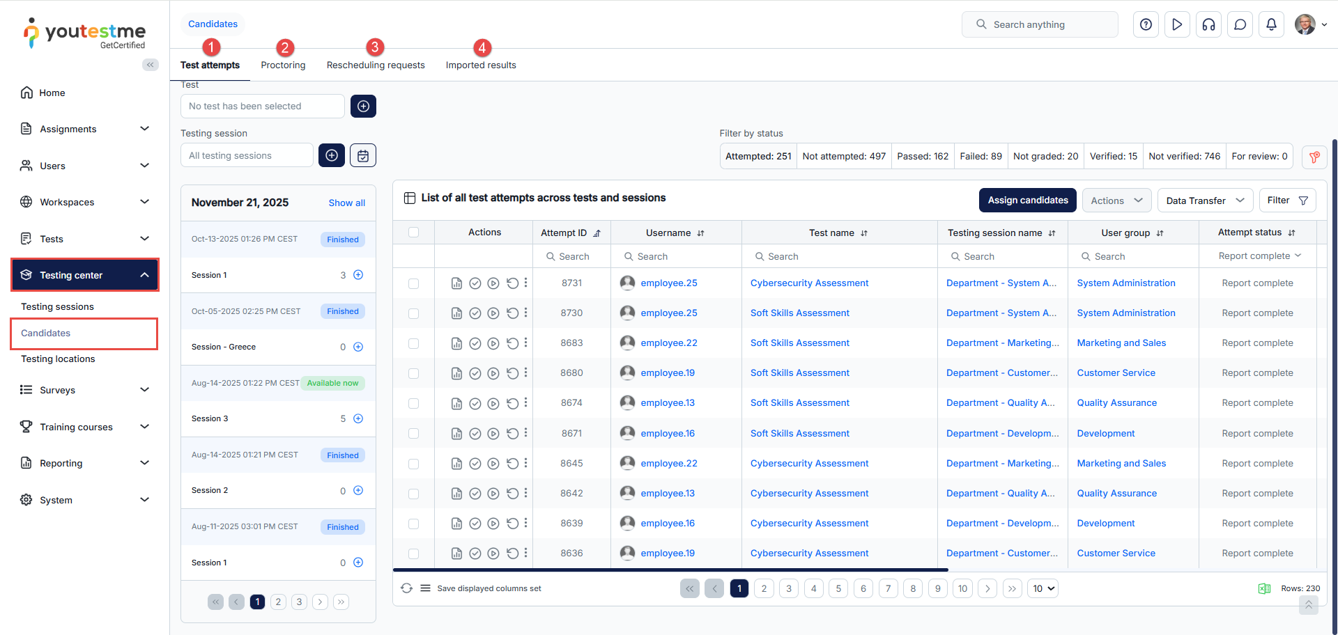 This article outlines how to oversee and review all test attempts from a single, streamlined page within the Candidates tab. From this central location, you can perform every aspect of candidate management for any test or testing session, including adding or removing participants, accessing test results, and proctoring exams.