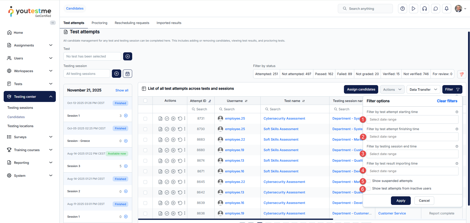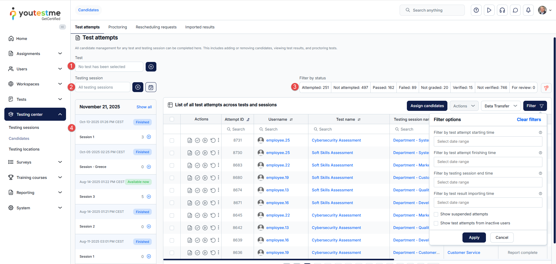 - Filter by testing session end time – Display test attempts that belong to testing sessions completed within the selected date range.