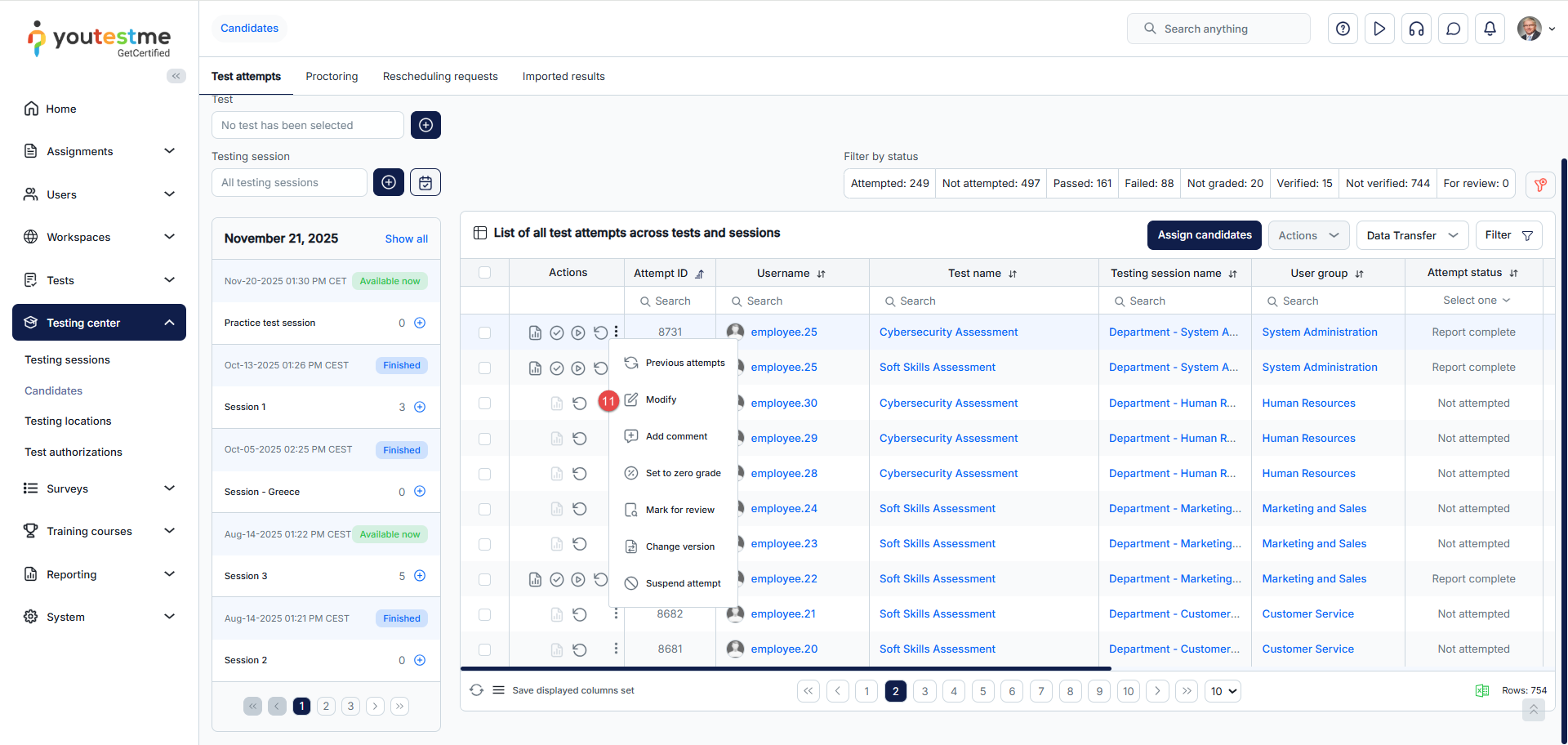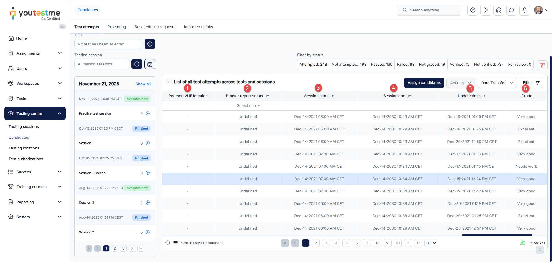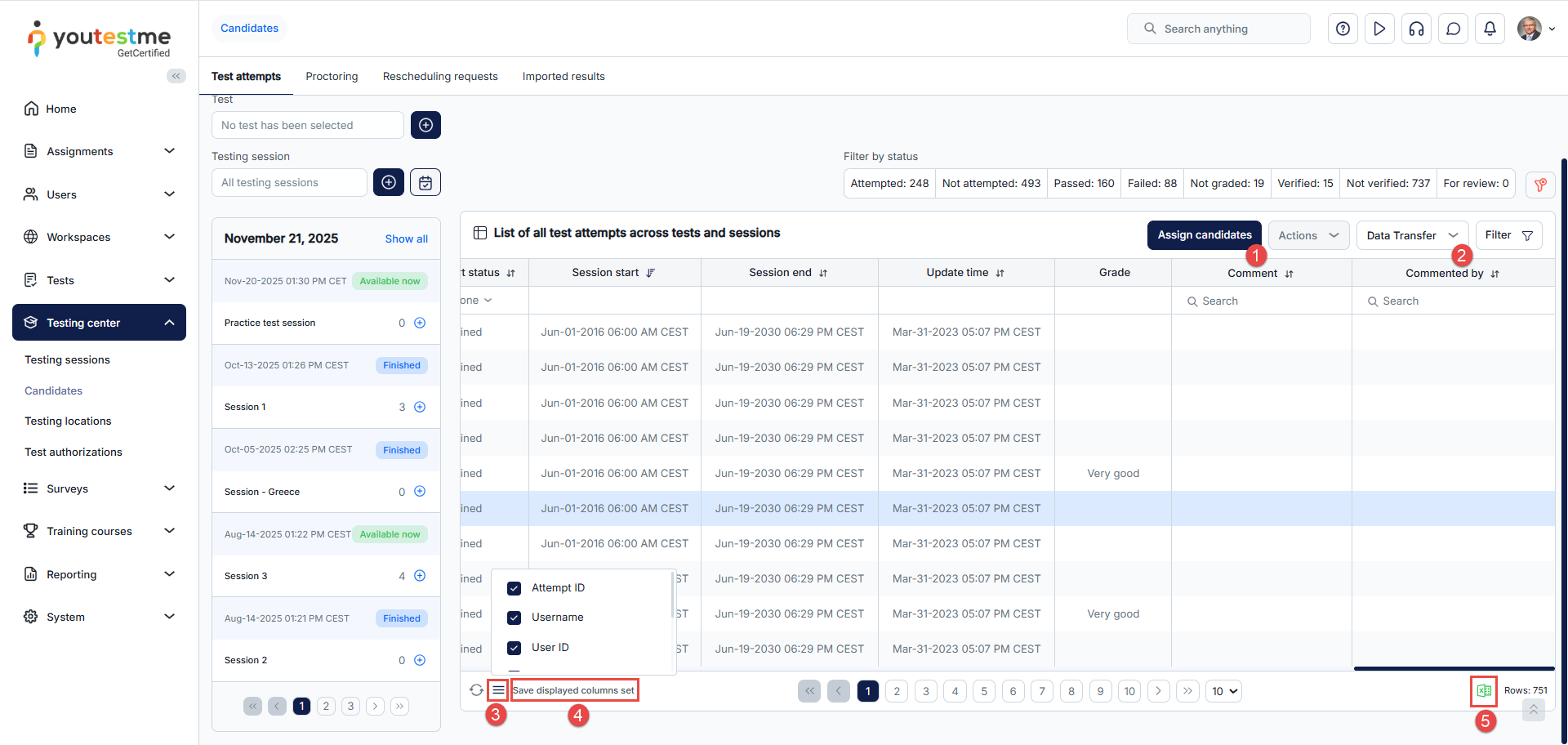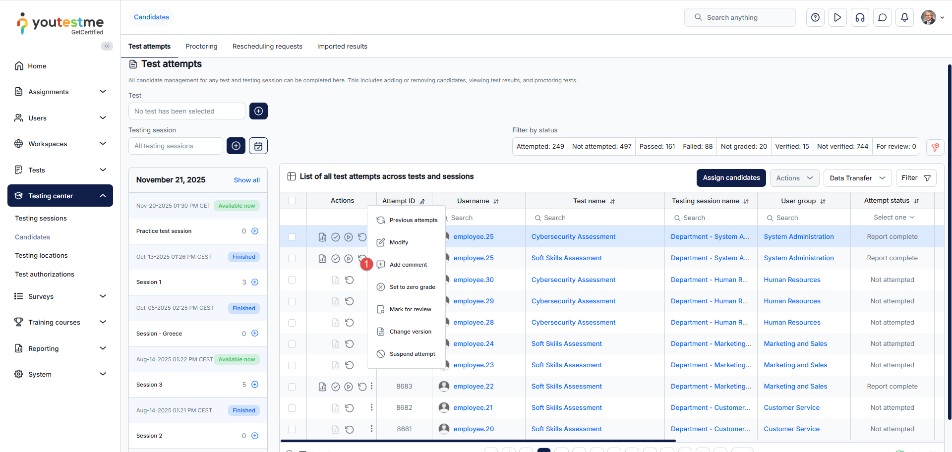 - Test attempts – Assign candidates to testing sessions or remove those already assigned, view their test attempts and grade them accordingly.